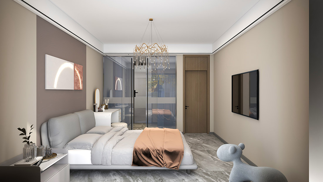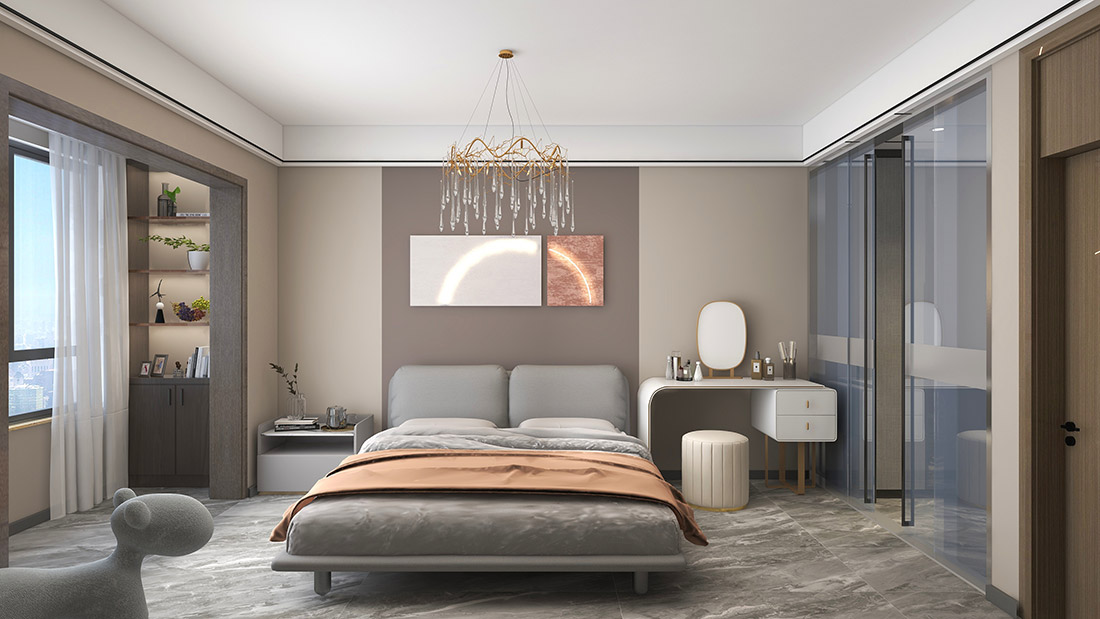 主臥把右側(cè)的床頭柜給女主人換成了梳妝臺,畢竟女生的第二次生命是化妝給的,右側(cè)的衣帽間做成了玻璃推拉門,在視覺上讓空間更通透,不會壓抑,在生活是也很方便