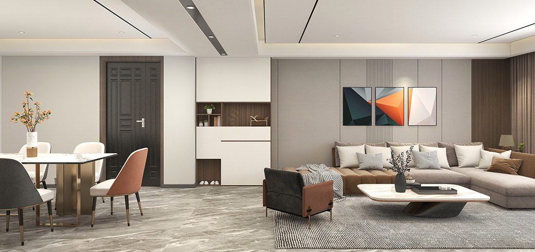 餐桌與茶幾同為巖板桌面,懂行的人才能看出與大理石的不同,沙發(fā)背景墻沒做過多復(fù)雜的設(shè)計,幾幅幾何畫便成為亮點