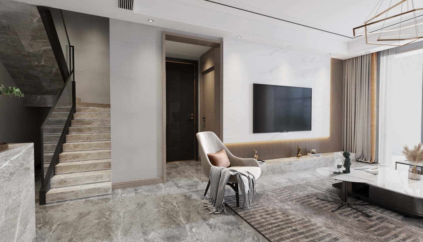 現代簡約的風格聽起來也是最簡單的風格,其實也最考驗設計師的功力,本案為頂樓復式,業主向往的簡約中又不失格調,時尚又不能太浮夸,所以設計師在現代簡約中加入了一些輕奢元素