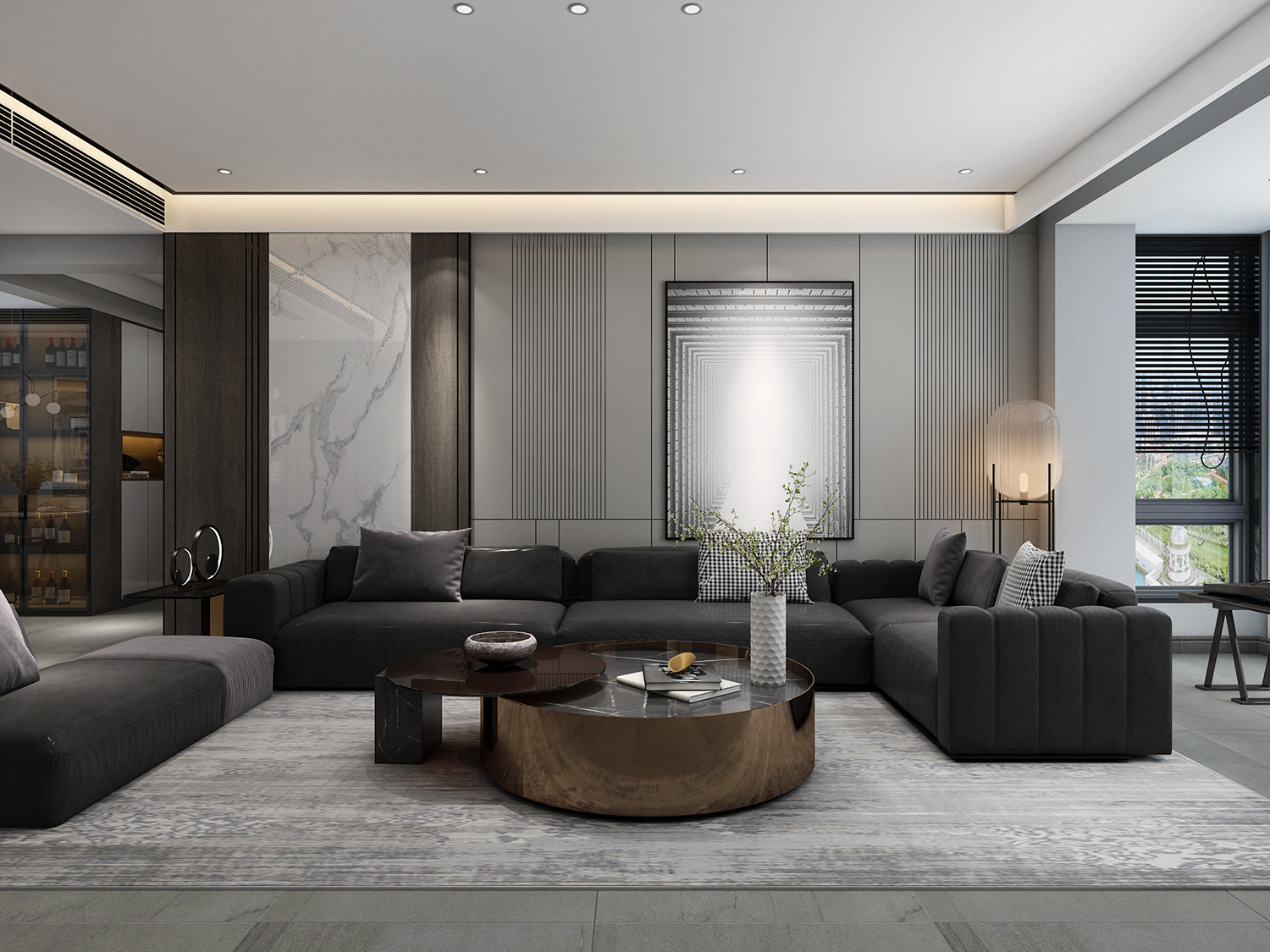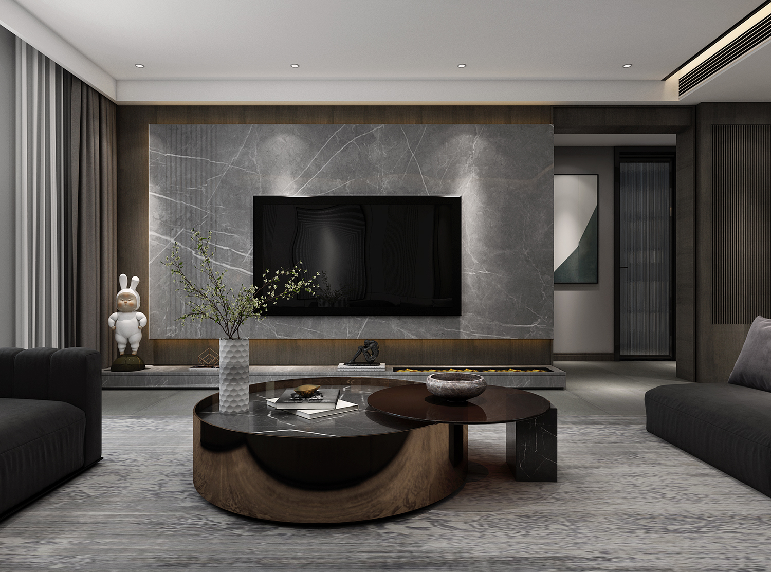 本案特點:利用灰色的布藝沙發搭配同色系毛絨地毯,奠定空間整體的沉穩高級基調。