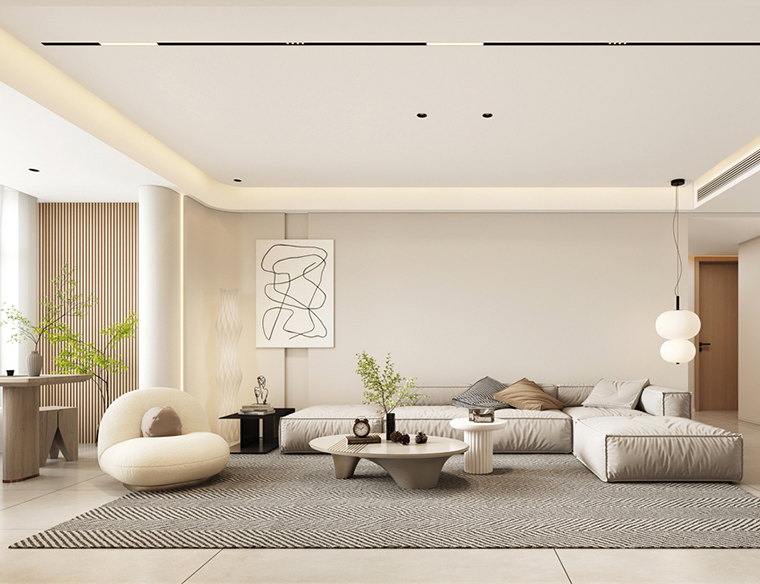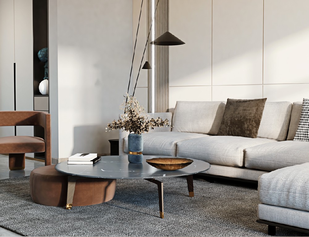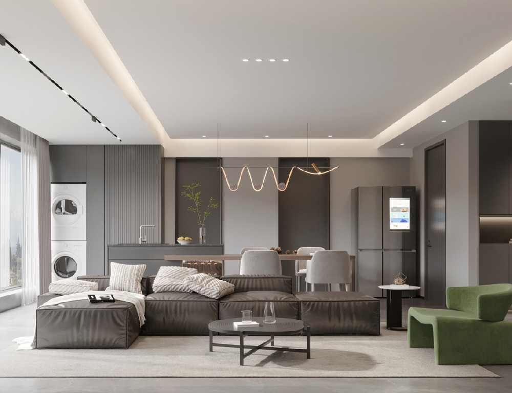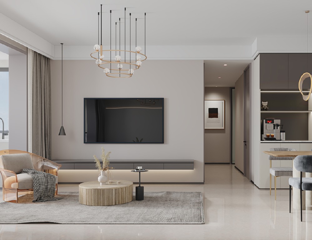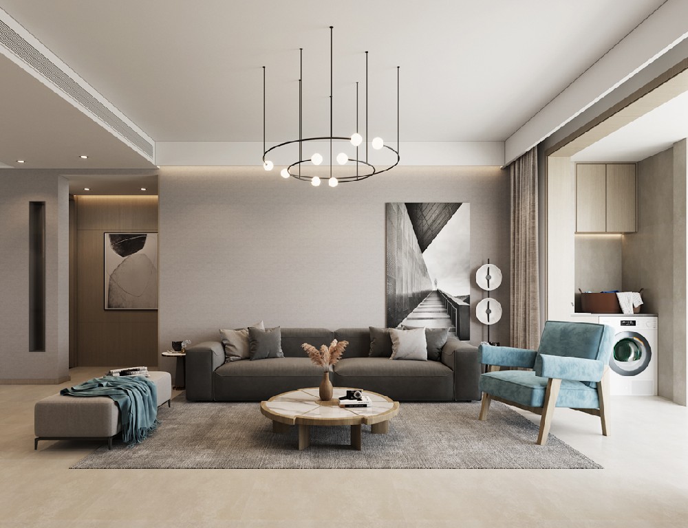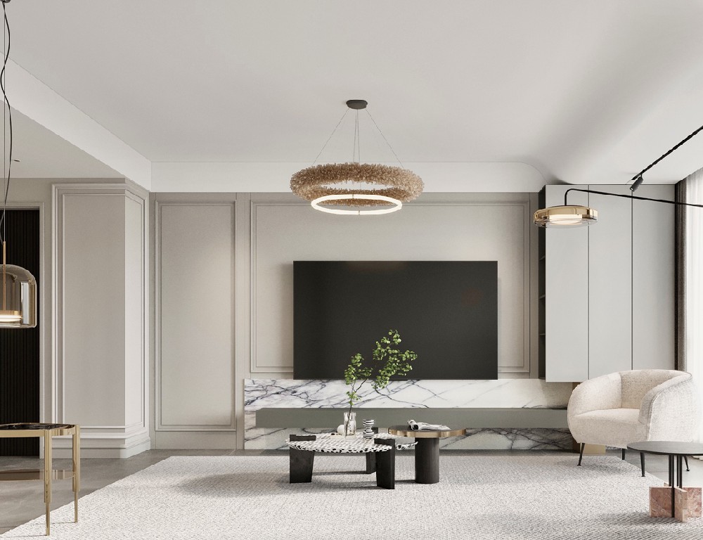 設計理念:客廳以灰色作為主色,黑白點綴其中,呼應電視背景墻的爵士白大理石,張弛之間,盡顯包容大度之態;落地氣泡燈活脫一個頑皮的精靈,平添幾分俏皮可愛氣;