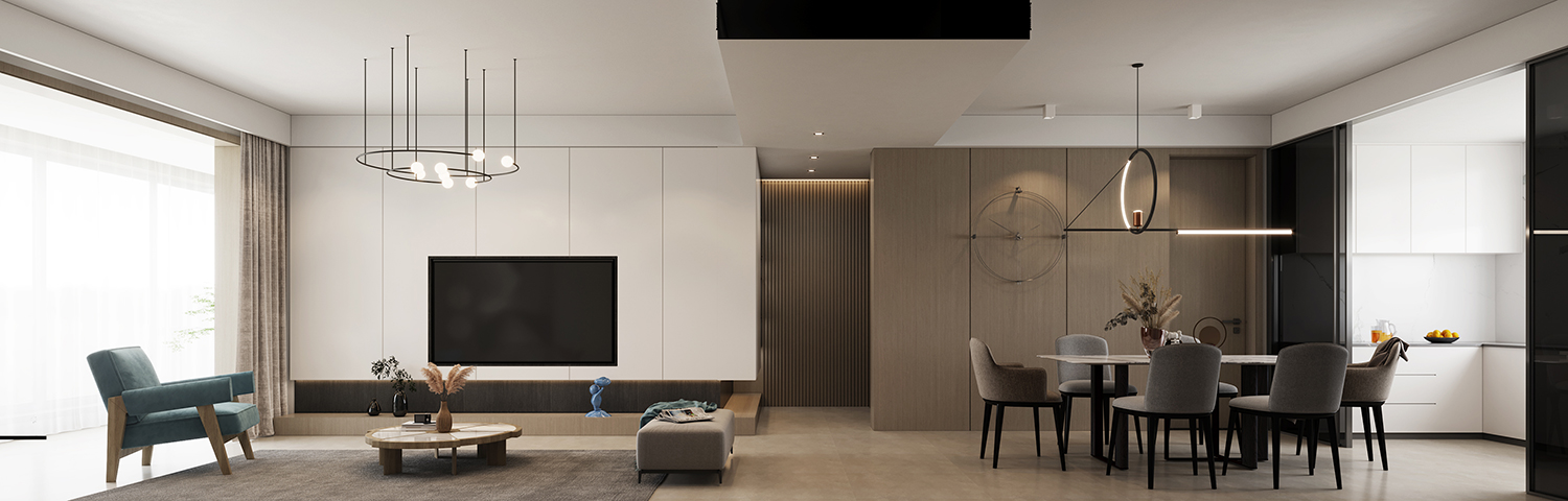 設計理念:本案最大限度還原居住空間本真的雅致溫情,素雅的色調與簡潔利落的線條有著日常的清新感,黑白灰在空間自然交錯過渡,釋放舒適、柔和的自然氣息。沉穩的自然光色中,有靜謐在其中生長。立面設計方面,以溫潤的木色為主題,主體墻面以序列的分割從餐廳延伸至電視墻主體。