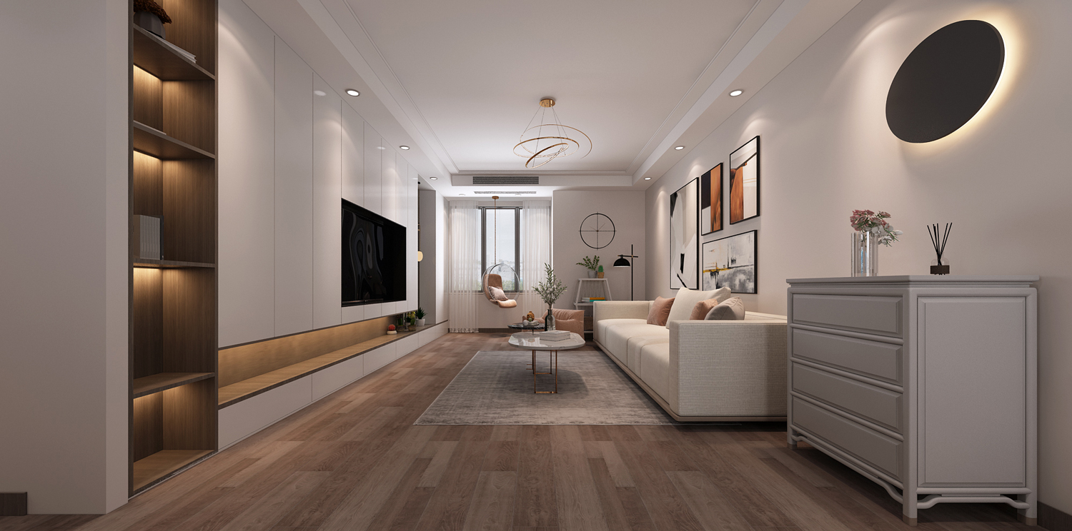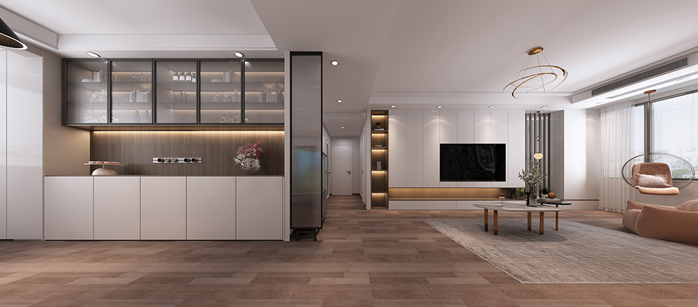 客廳:此戶型南向臥室較小將南向陽臺歸于臥室所用,同時為增加客廳采光,保護臥室隱私,采用隔柵作為南向陽臺與客廳之間的隔斷,既保證了客廳的采光,也維護了臥室的隱私,電視墻的儲物格設計滿足了客戶收納需求,由于客戶不需要晾曬陽臺,北陽臺融為了餐廳的一部分,餐邊柜與儲物柜的設計讓整個空間連貫的更加完整,公共區域最大化的收納滿足了客戶后期人口變化對儲物的需求