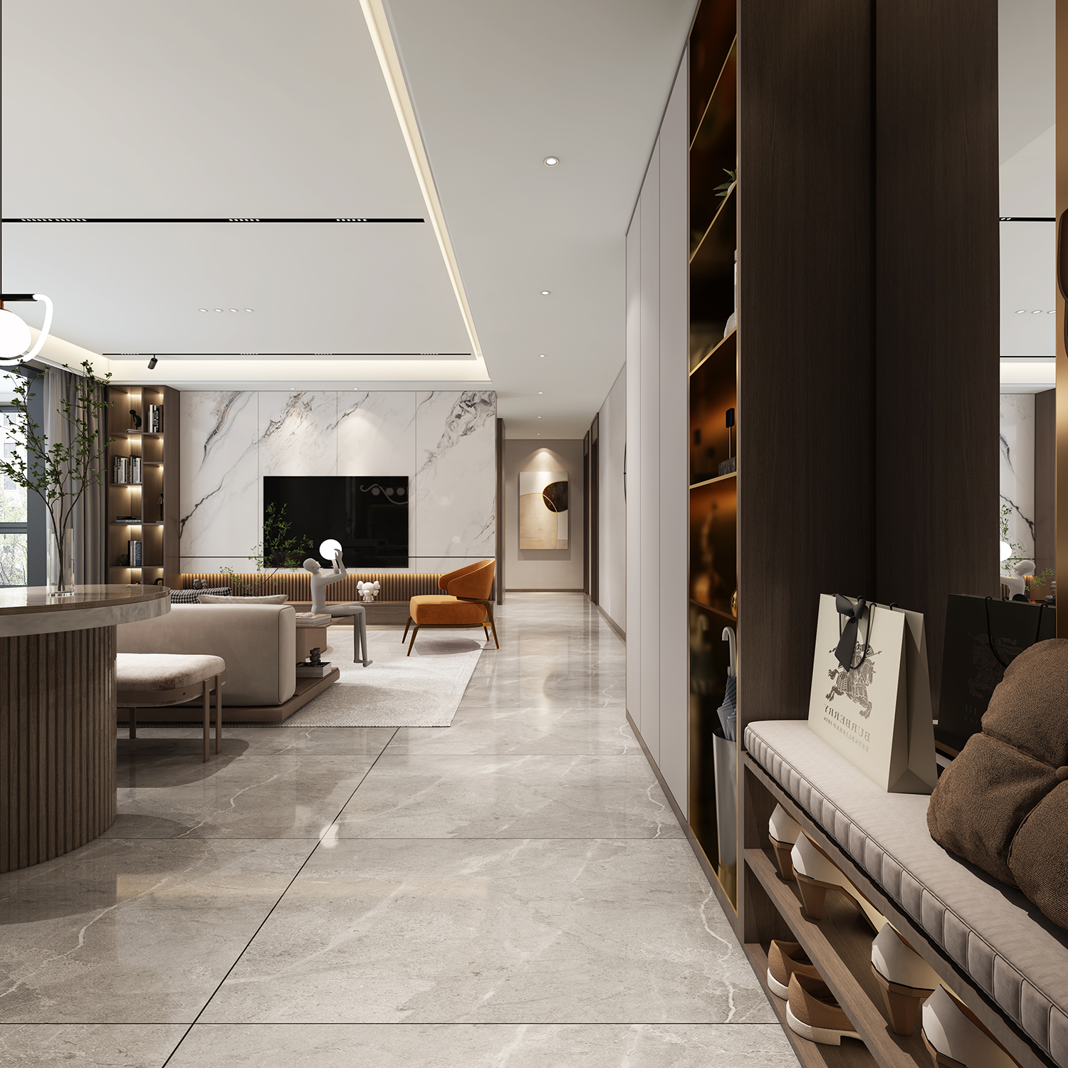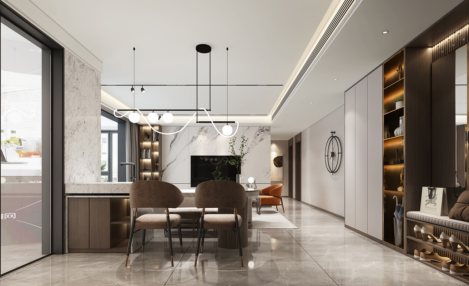 設計理念:客廳、餐廳與工作區融合實現多場景對話打造生活空間,以連貫的手法和語言造型呈現,向內外延伸。開放式的格局,讓空間更為寬敞通透,營造舒展的氛圍。