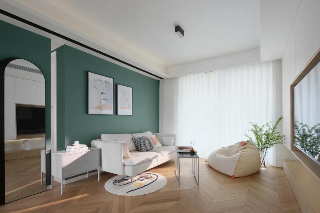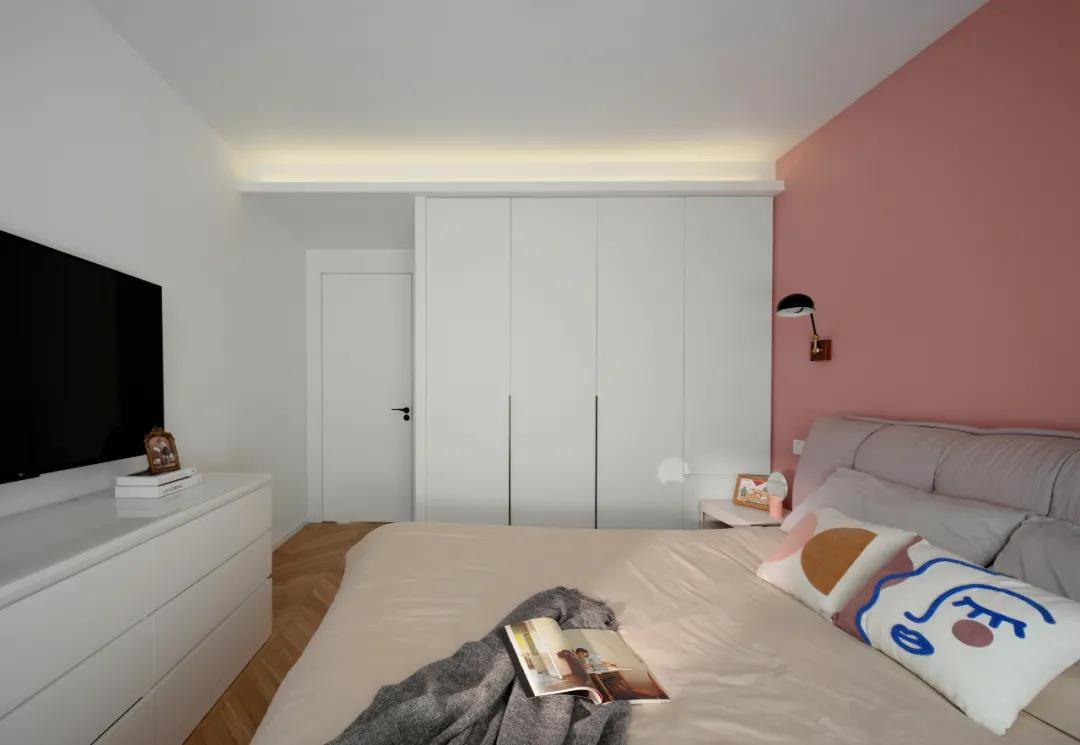 不同的色彩將公私區(qū)域做了清晰的區(qū)分,與客廳安靜大氣的灰綠不同,主臥背景墻用粉紅色營造出歡快甜蜜的私密氛圍。