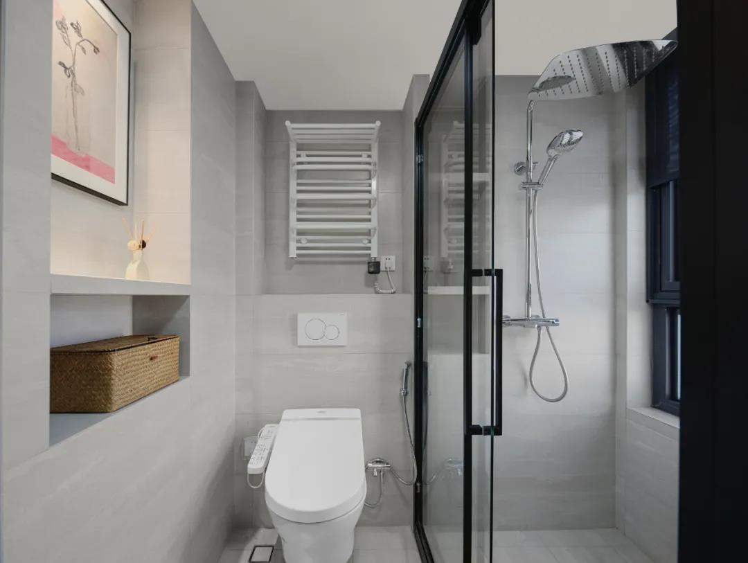 馬桶旁置物壁龕方便手機(jī)、書刊的放置,同時利用水箱上方的區(qū)域巧妙安裝了電熱毛巾架,設(shè)計細(xì)節(jié)貼心周到。