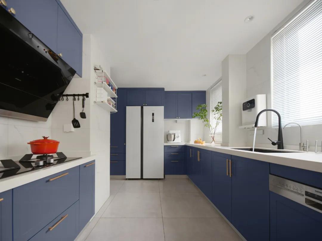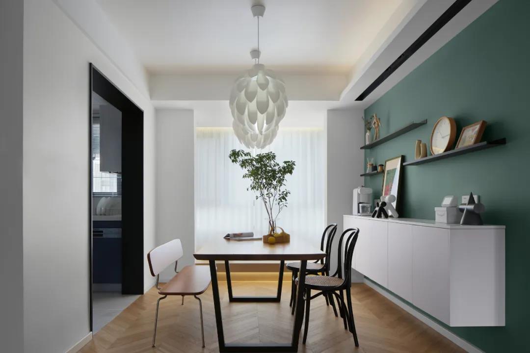 相連的客餐廳利用相同的色彩和材質(zhì),形成開放通透、風(fēng)格統(tǒng)一的起居格局,既保留了各自獨立又弱化邊界。