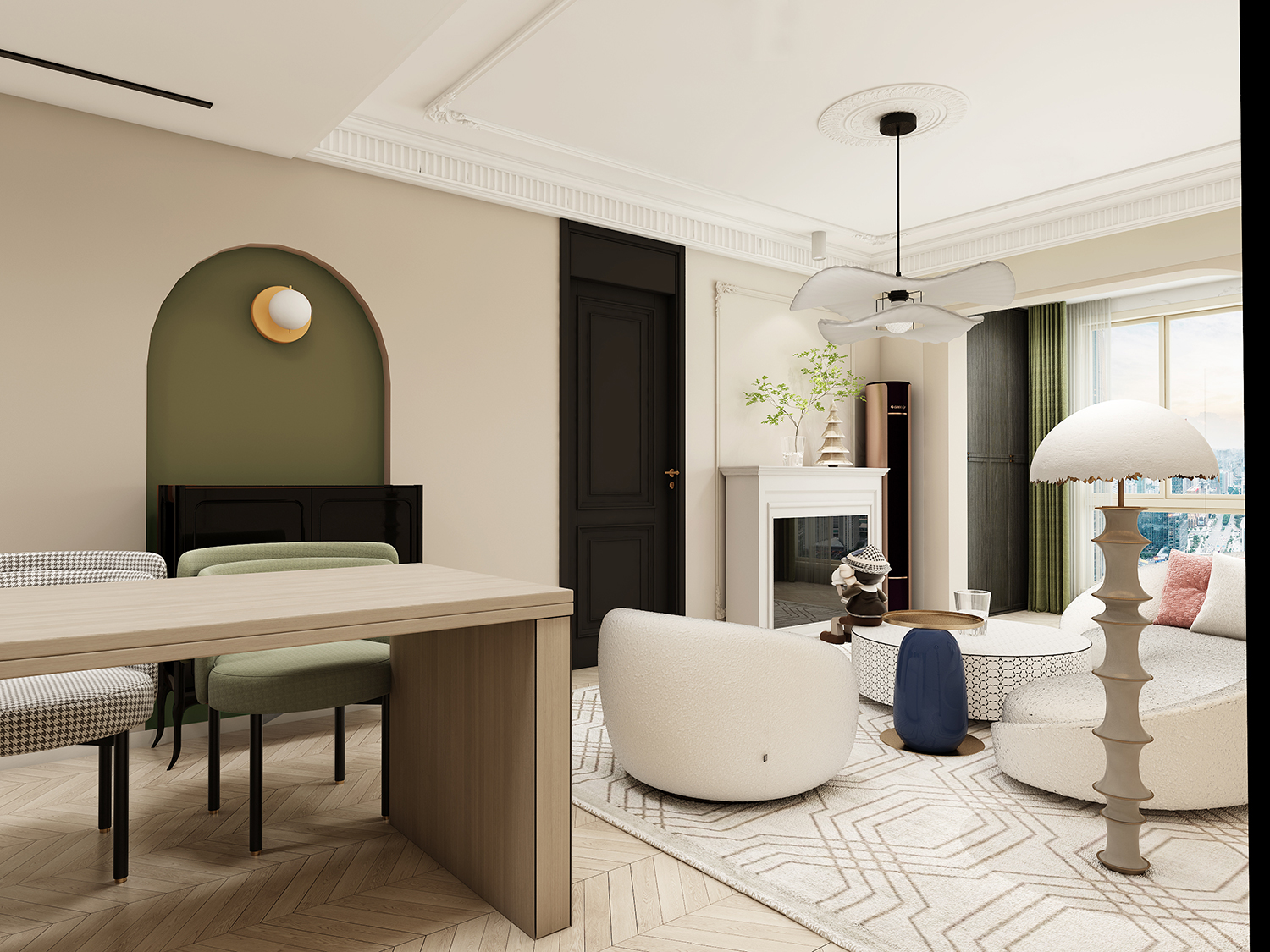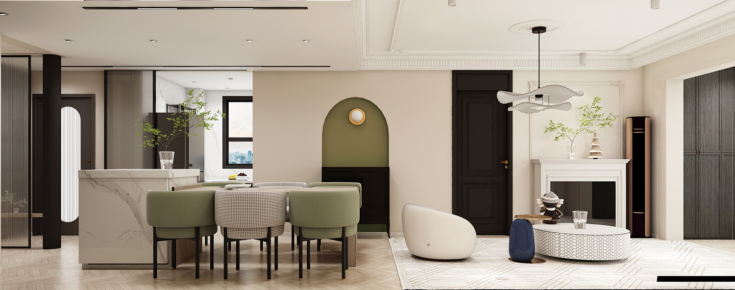 拱形元素,雕花,燈盤,軌道燈,室內空間復古優雅,公共空間清新明快,讓生活感到幸福也就是這么簡單了。
