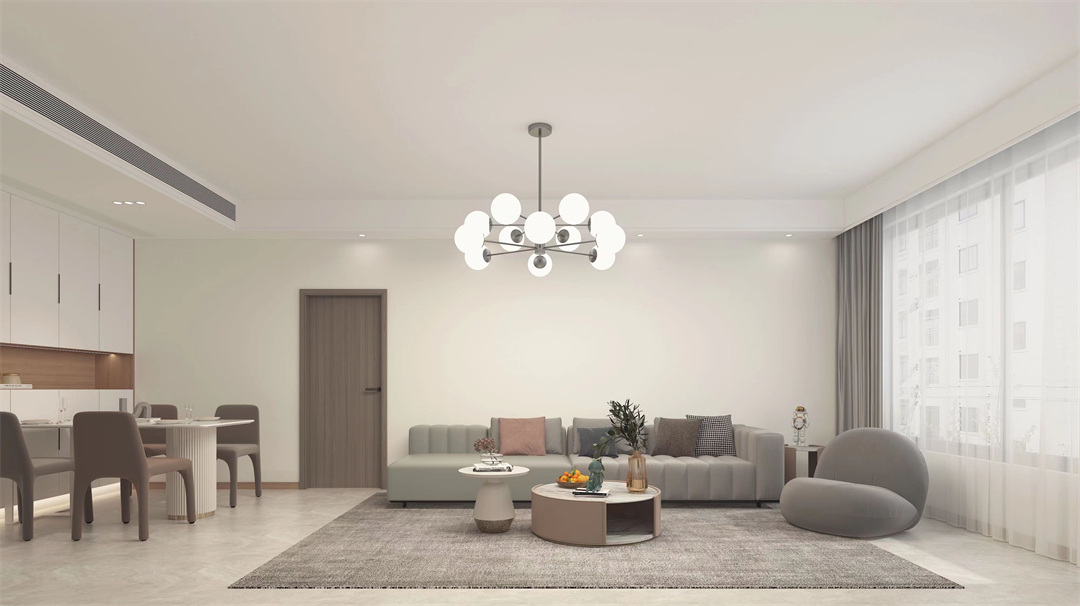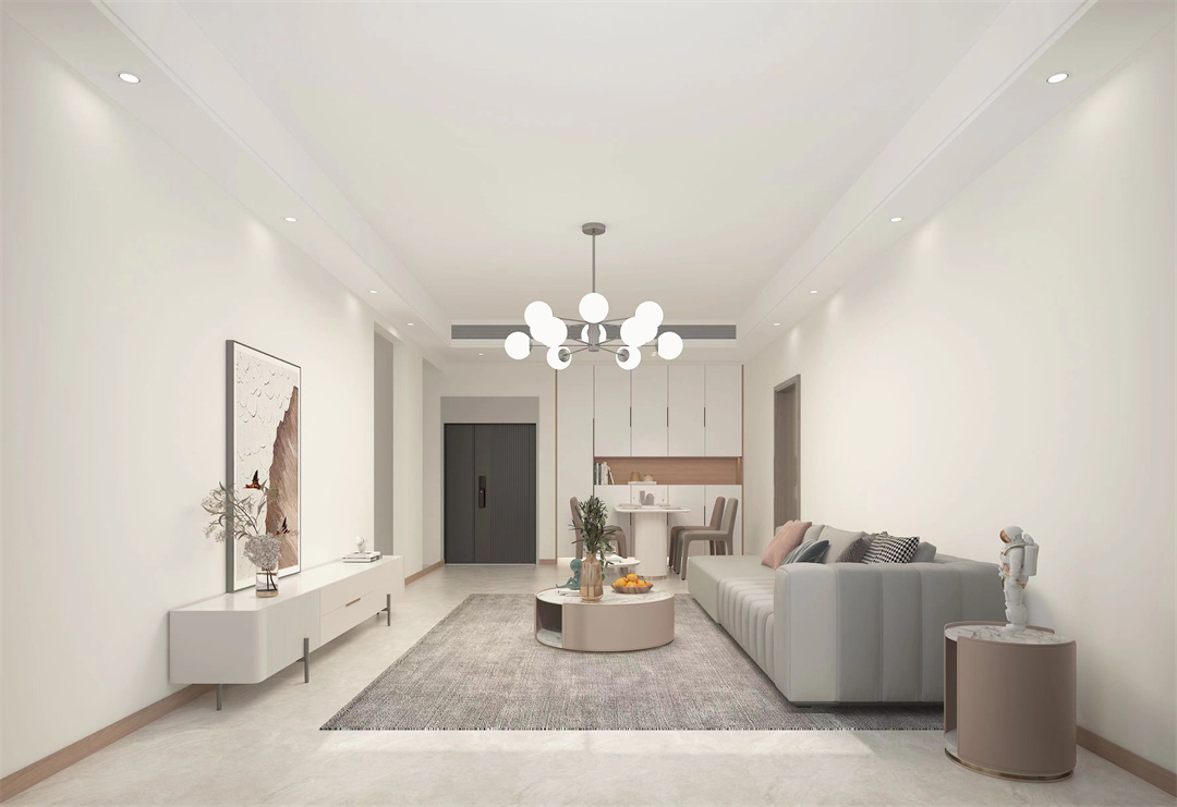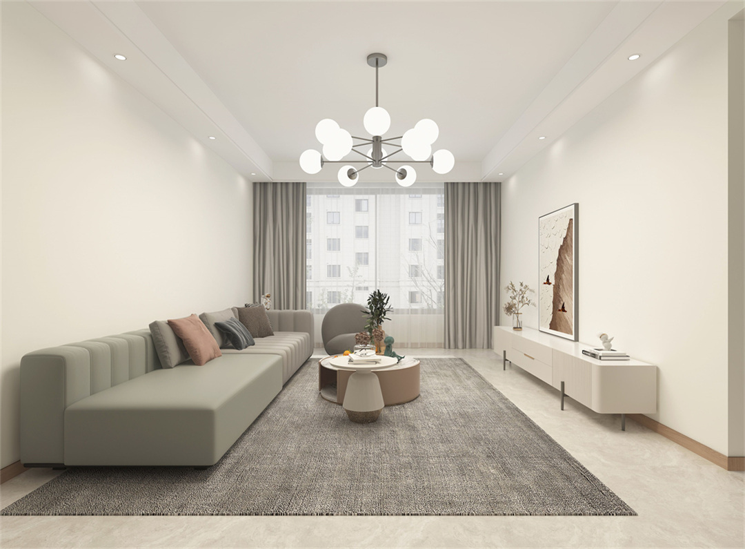 客廳墻面以乳膠漆為主,取消電視的設計,強化空間感。