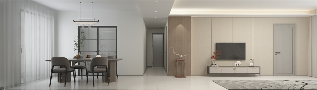 電視墻以護墻板做整體設計,通過線性分割,彰顯空間力量。