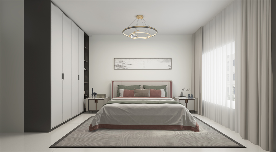 主臥常規布局,沿用淺色系雕琢空間,營造一個清淺舒適的休息空間。