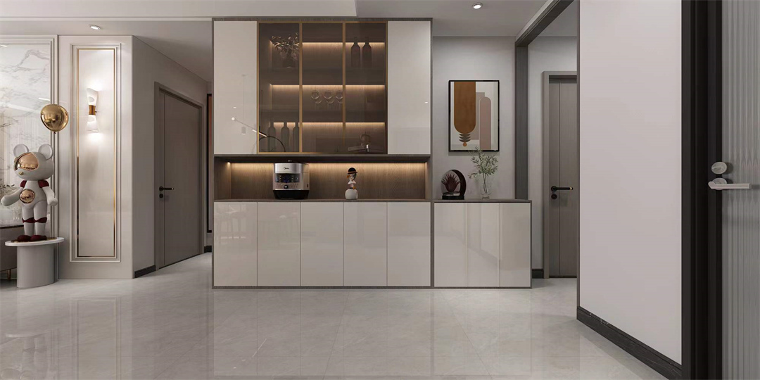 餐邊柜融合酒柜功能,以玻璃結(jié)合門板的形式交錯(cuò)呈現(xiàn),實(shí)現(xiàn)美感與功能的雙重效果。
