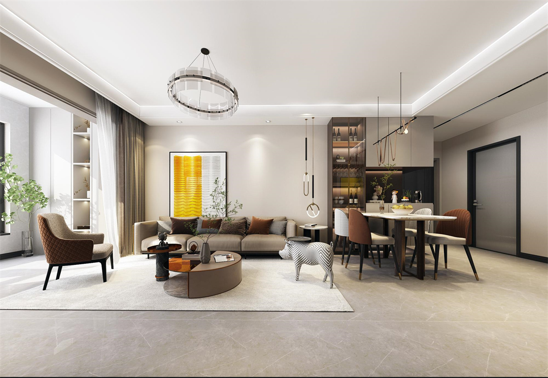 客廳的整體設計簡潔明快,呈現出奢而不華的視覺效果。采用線性燈和防眩筒燈的設計,過道安置了磁吸軌道射燈。