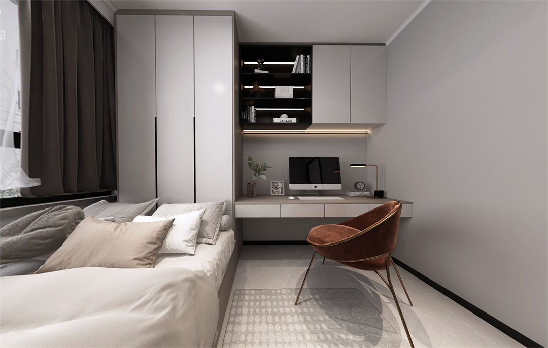 次臥整體空間定制,衣柜連接書桌,增強功能的實用性。