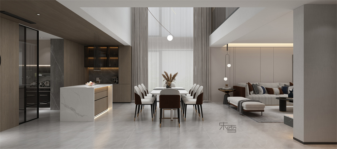 餐廳區域挑空,與廚房、島臺、餐廳形成聯動,塑造空間秩序的美感。