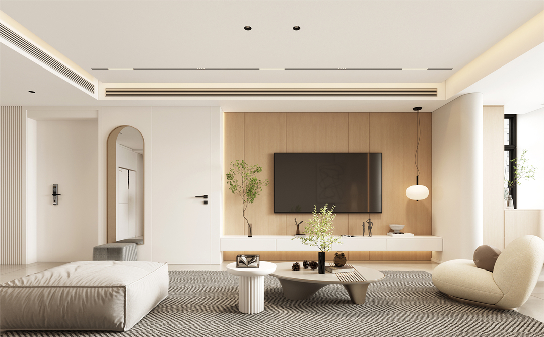 電視背景墻采用原木色板材,懸空柜子的設計方便業主日后打掃衛生。