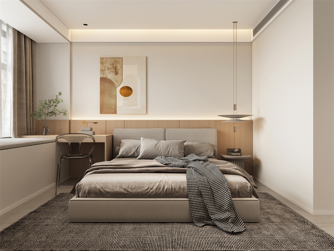 主臥和客廳一樣通鋪地磚,懸浮吊頂無主燈設計,簡潔又不失高級。