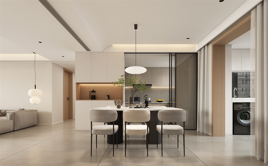 一眼望向餐廳,仿大理石餐桌搭配布藝餐椅,高級感十足,餐桌上的綠植凸顯業主的生活方式。