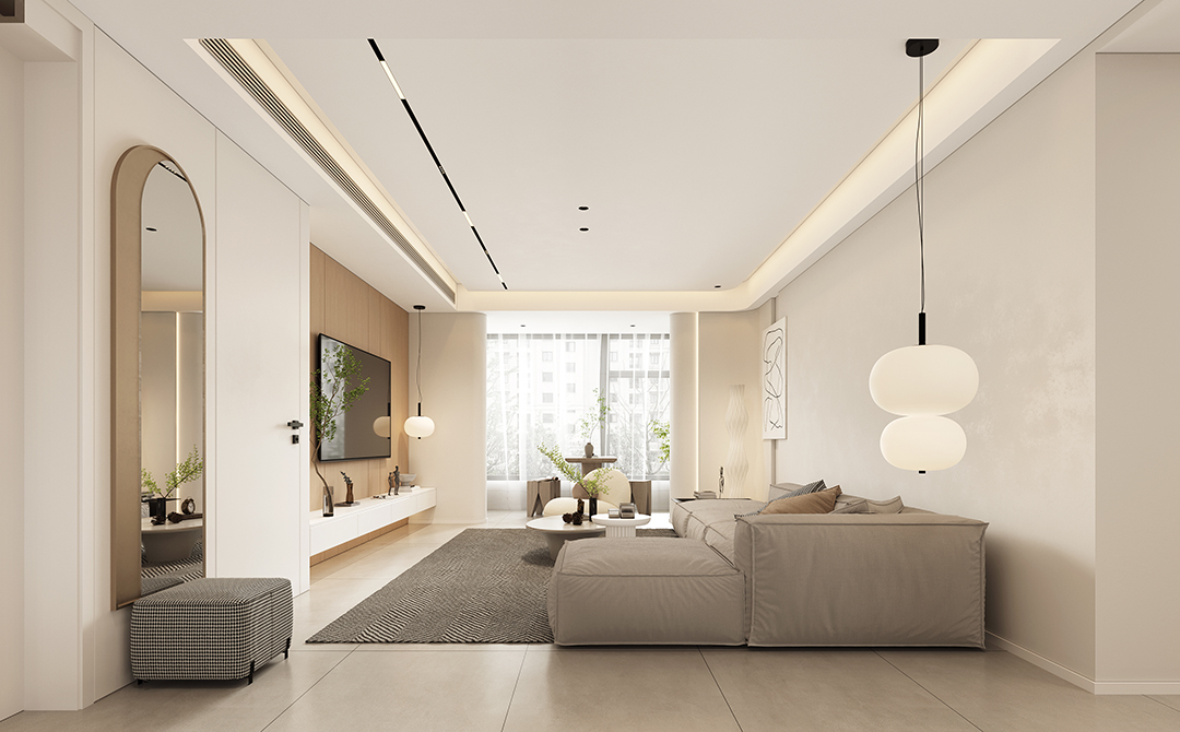 整體以白色為主,把極簡之氣滲透到每個角落,陽臺納入客廳,增加室內采光的同時,也提升了室內空間的深度。