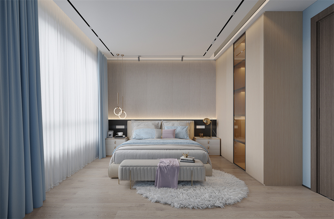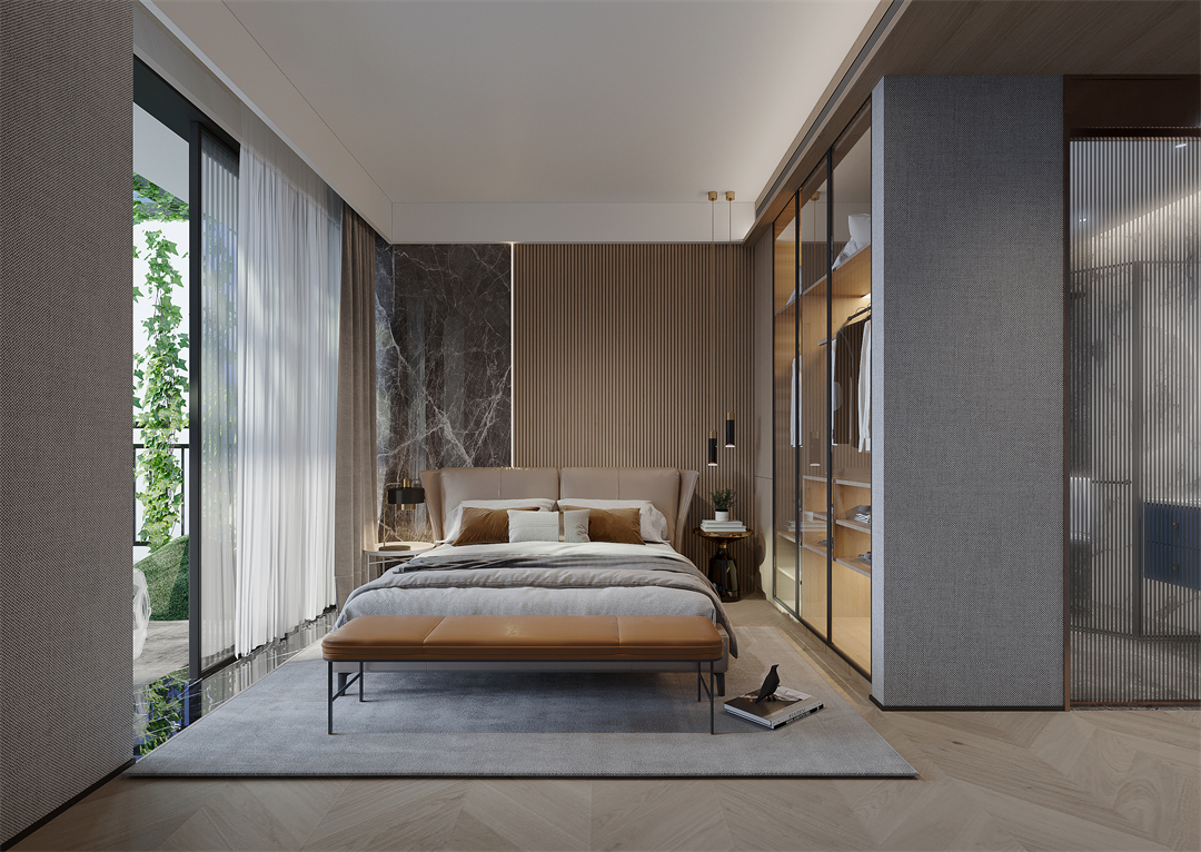 主臥以現(xiàn)代元素為主,木柵格+大理石作為床頭背景墻,個性張揚(yáng)又大氣。