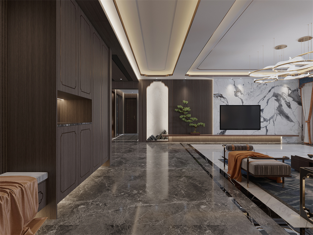 本案特點(diǎn):業(yè)主是三世同堂,老人喜歡中式的典雅,而女業(yè)主喜歡現(xiàn)代風(fēng)格的輕奢與質(zhì)感,因此將家里定位成新中式風(fēng)格,這樣滿了兩代人的裝修需求。