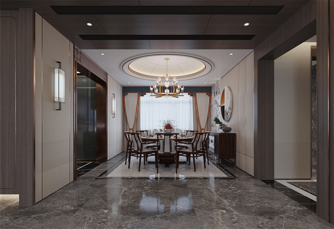 餐廳這里巧妙地將中式韻味和現(xiàn)代感重新組合,圓形吊頂與餐桌和諧統(tǒng)一,整個設(shè)計(jì)簡潔溫馨。