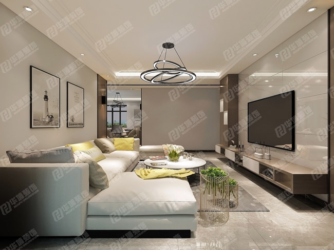 客廳在色彩的搭配上,摒棄了重口味的操作,選用了比較中和的灰白,讓空間整體看起來更加隨和。