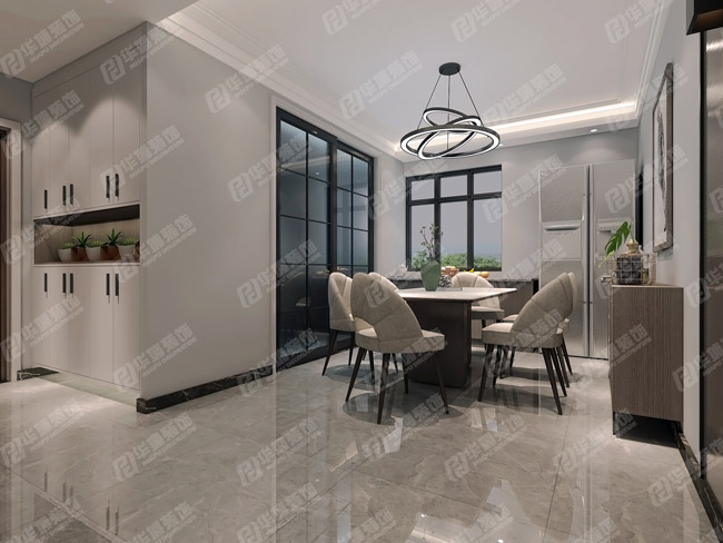 餐廳延續客廳的整體格調,灰白的空間,在燈光下,更顯沉穩雅致。