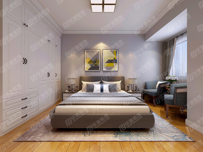 三個臥室,三種不同的品味。主臥依舊是灰白,用木地板來調和色彩,低調不失內涵。靠窗兩把休閑椅的設計,倒是讓空間更加輕松閑適。