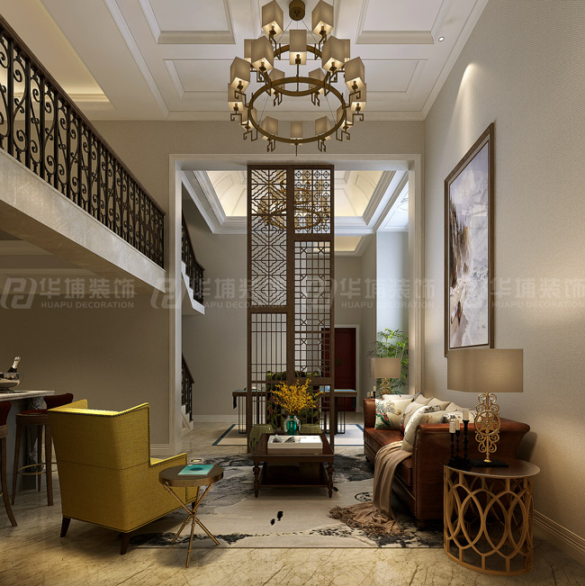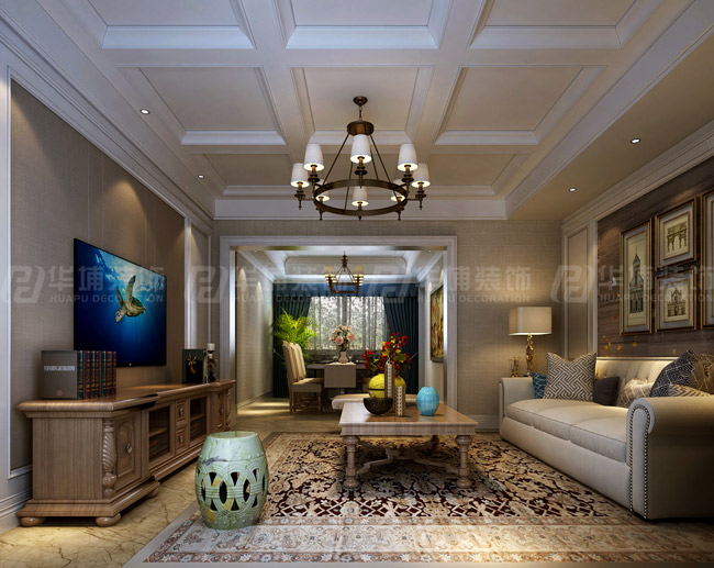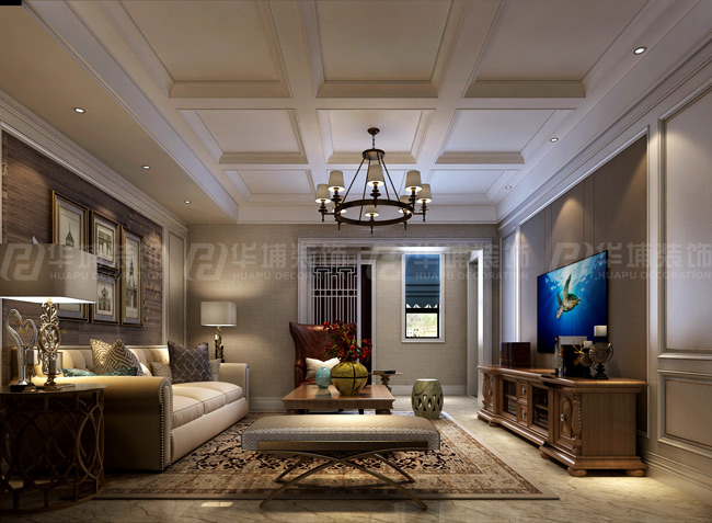 民安北郡400平復式美式風格一樓客廳裝修效果圖