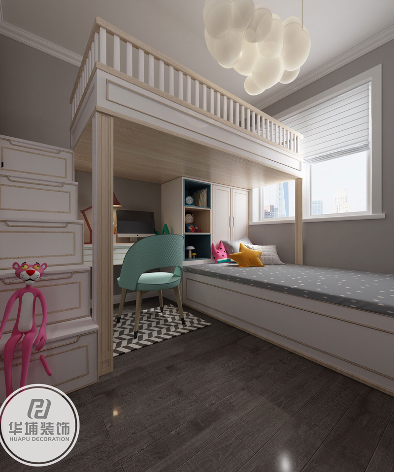 設計理念:對空間利用和收納比較關注,同時希望給三個孩子充足的學習和互動空間,所以將原有的陽臺打掉改為升降臺式榻榻米,既可以學習看書,也放方便孩子玩耍。同時在餐廳處設置卡座空間,充分利用卡座下方的儲物空間。兒童房采用高低床的設計,可以兼容兩個寶寶的學習和休息空間。