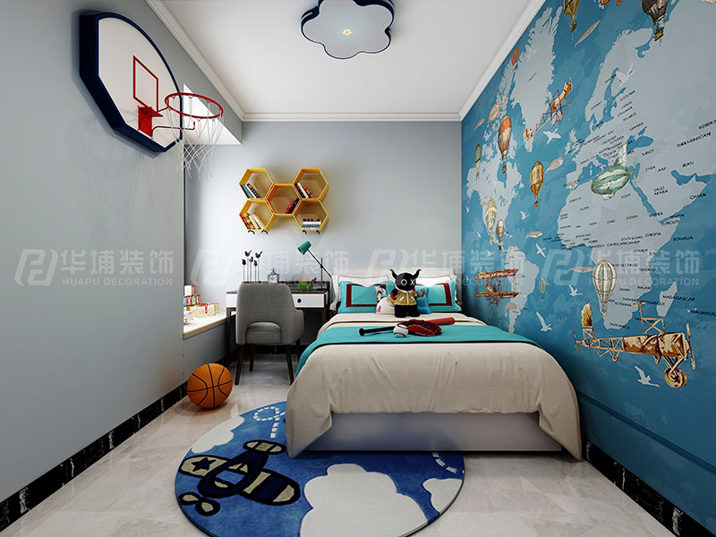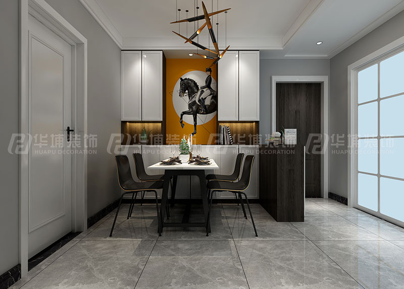 本案特點:室內的頂、墻、地三個面,完全不用紋樣和圖案裝飾,只用線條、色塊來區分點綴