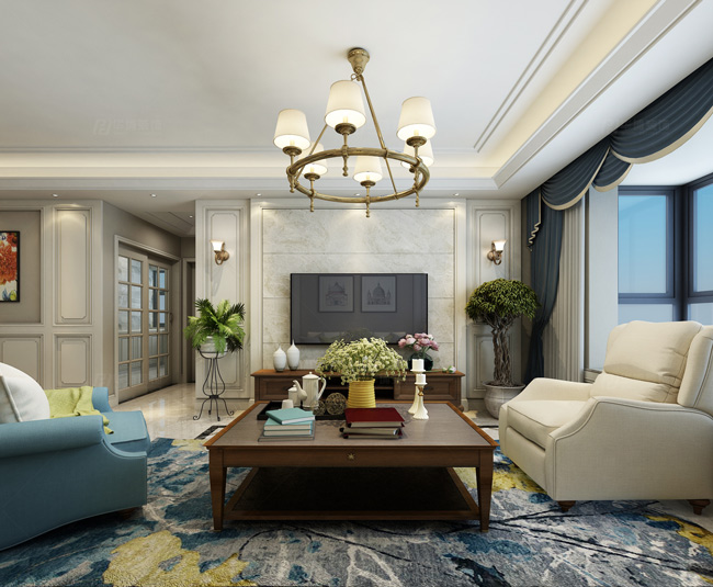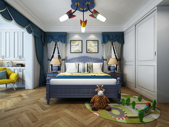 設計理念:本案在設計上保留了美式的優雅浪漫,以淺色作為主色調,藍色作為點綴色,擴展了空間的視覺張力,使其變得更鮮活,靈動。一深一淺的色澤差異也使得空間更具層次感。