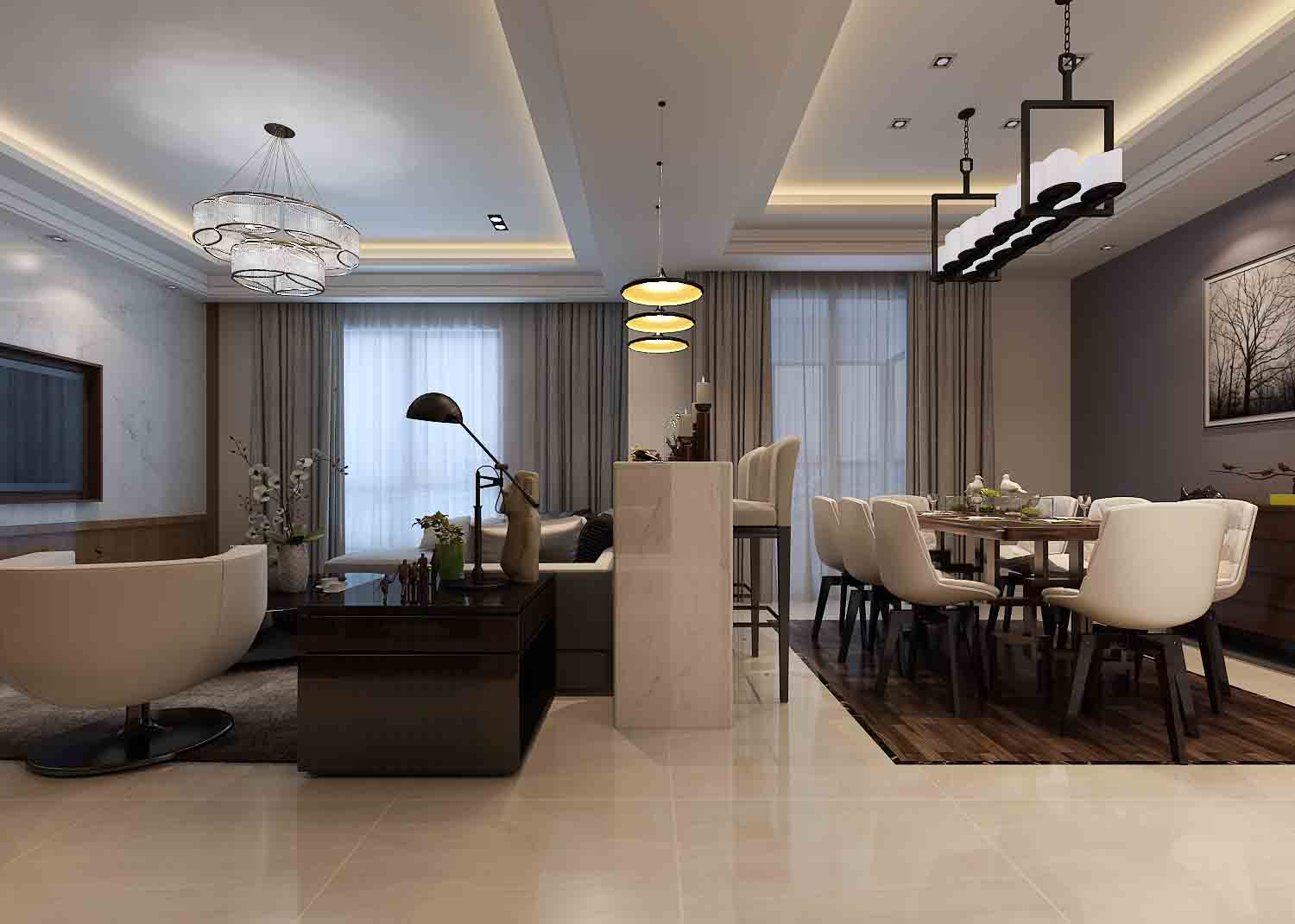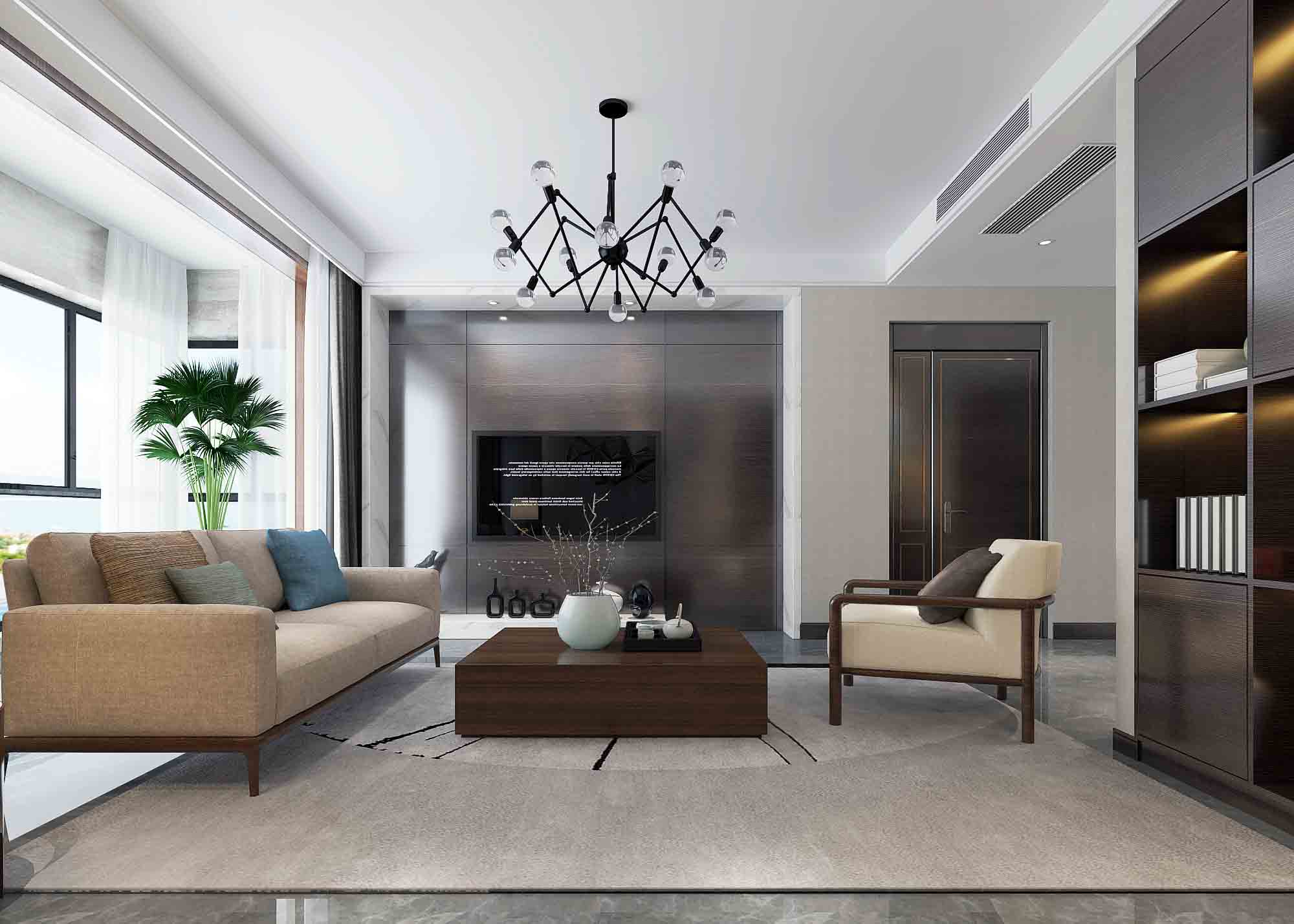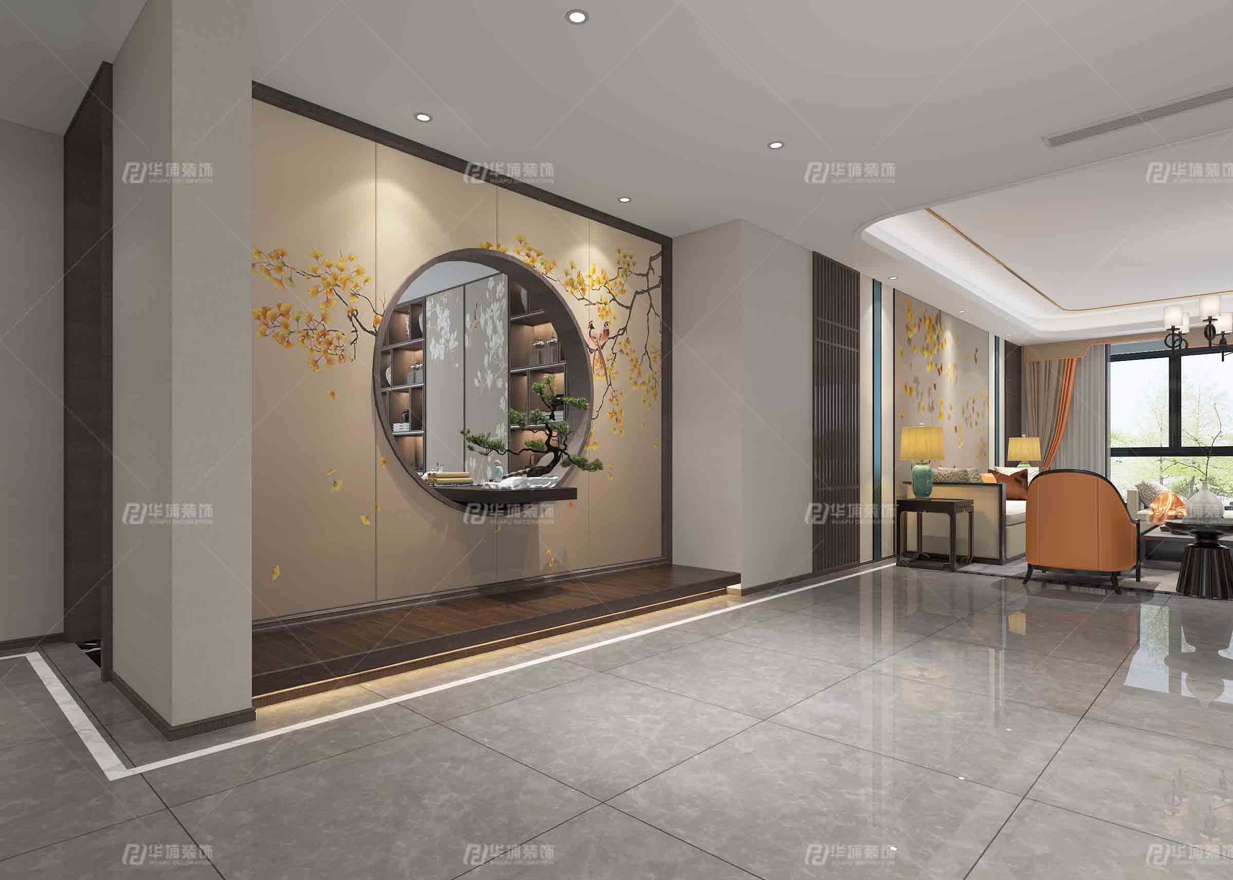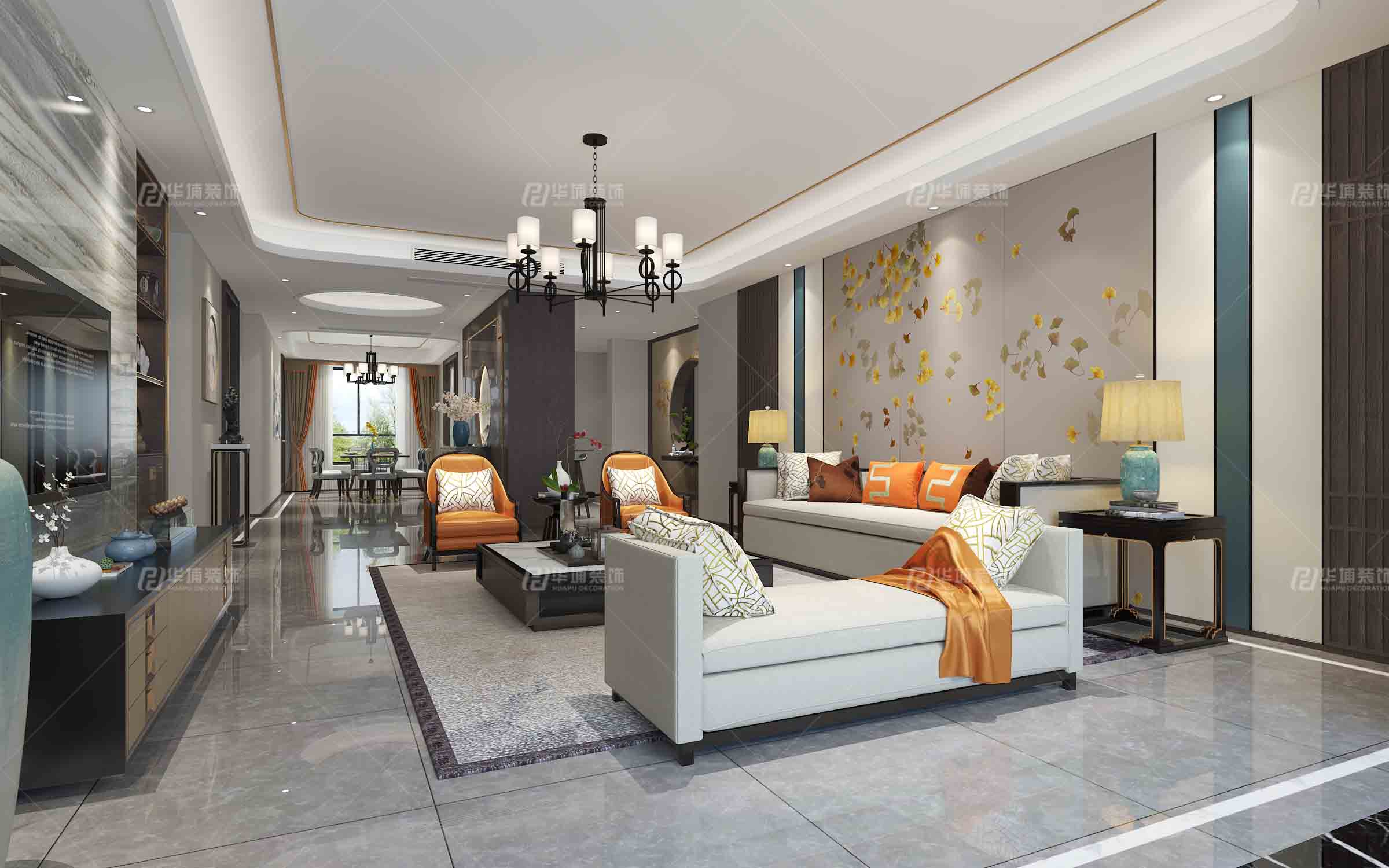 客廳設計彰顯著對回歸傳統精神生活方式的主張。筆墨紙硯、茶道瓷品、綠植小件表現著空間的中式情懷,于端莊大氣中透著內斂的文雅風韻