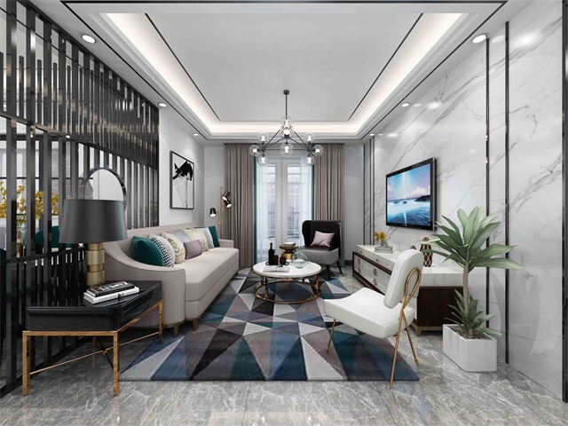 地面走撥打線呼應頂面造型,整體感十足。電視背景用整面石材設計,加以護墻板跳色。電視柜采用懸空設計,后期更加方便打理衛生。整個電視背景7米長處理后協調,美觀。整體裝修簡約大氣。