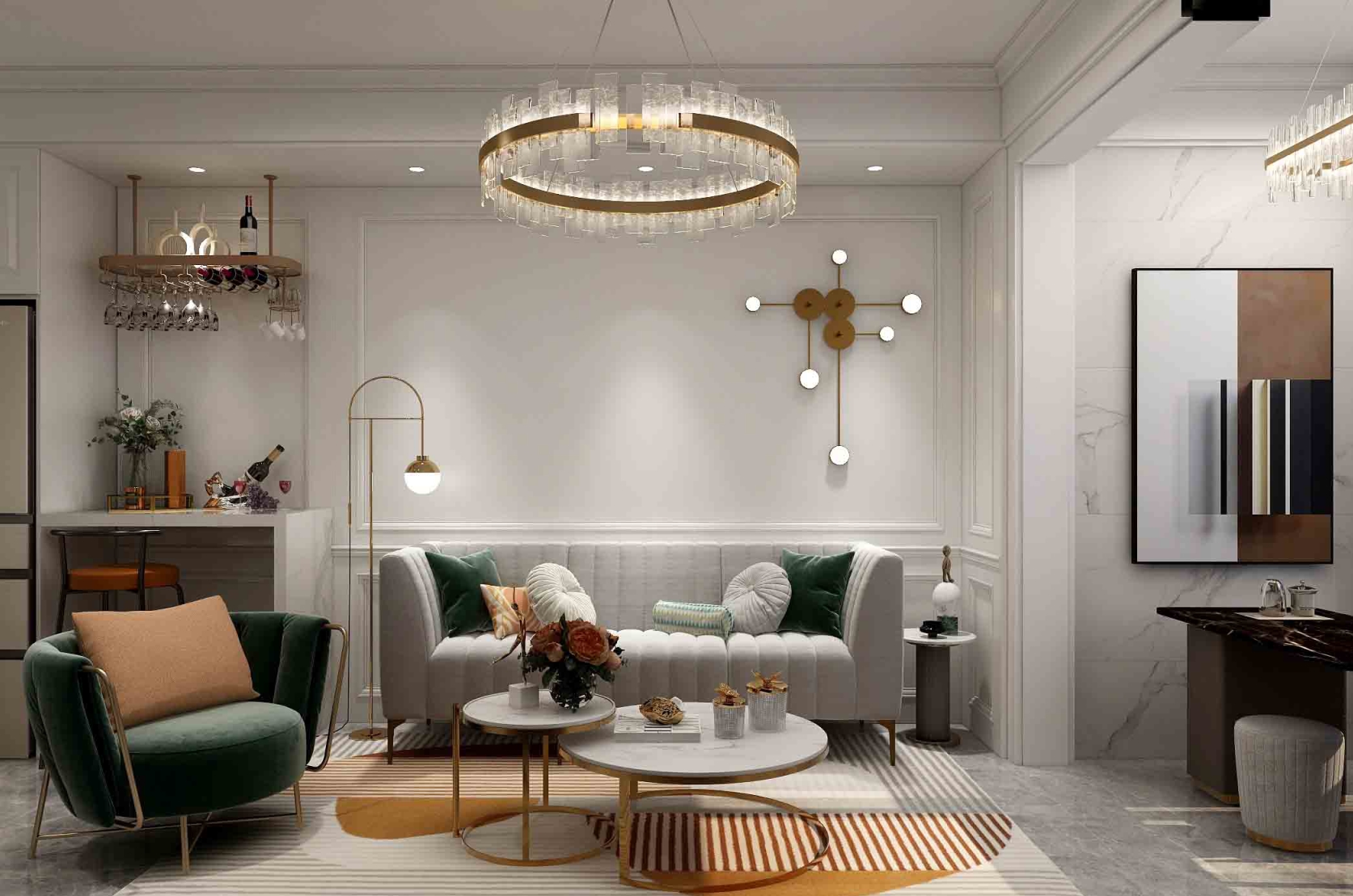 設計理念:安靜是對熱鬧世界的藝術化補充,自帶一種直擊人心的力量,讓人包容復雜,接納簡單,從而發自內心的接納生活。結構,面料,材質,色彩在整個家里面使用的恰如其分,將藝術多元形式融入其中,在于恰到好處的反差美,繁復的細節與大氣的格局構成微妙的平衡。