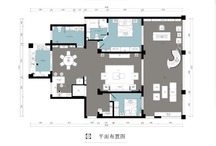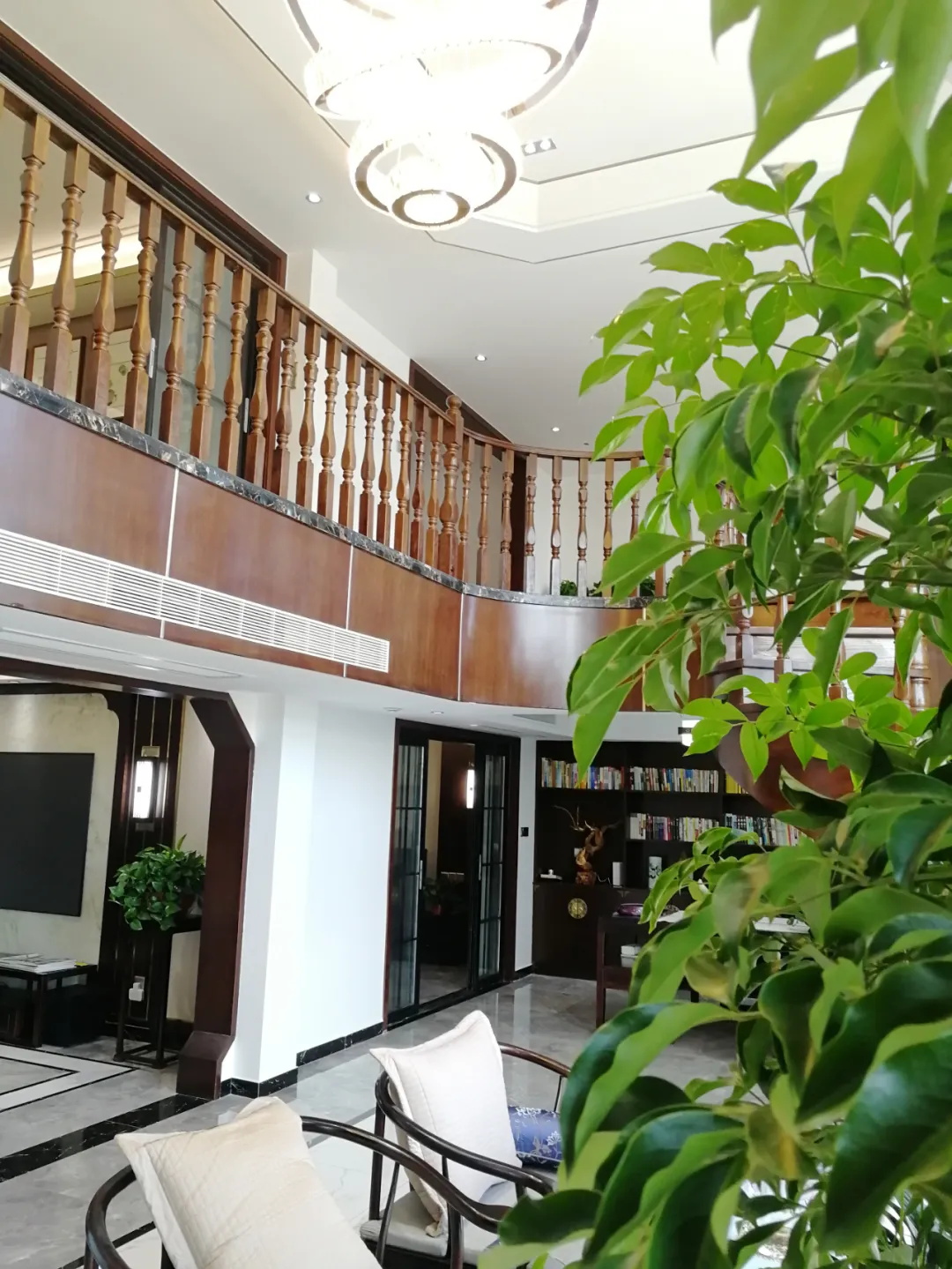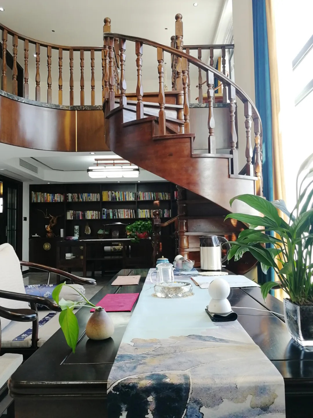 重點來嘍!50平方的大露臺,挑高空間,也是施工最大的難點。沒有任何的立柱做支撐點,10米的錯層,回旋的樓梯,疊S造型水晶吊燈,在這里品茗休閑,實在暢快!