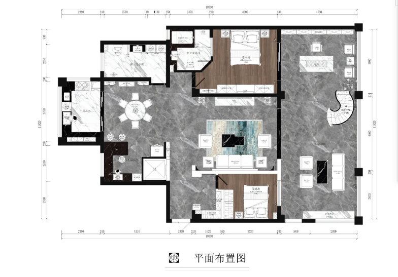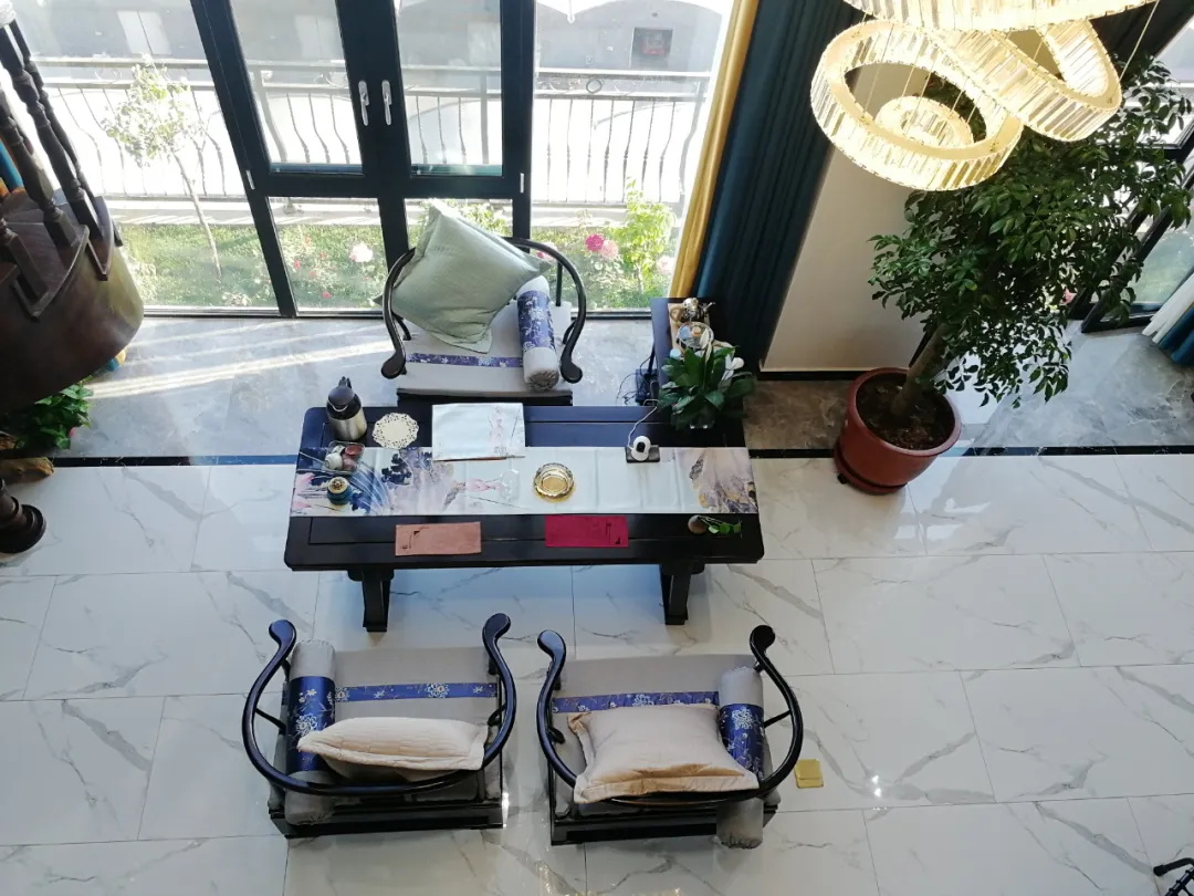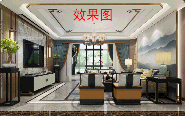 中式講究對稱,客廳也是頂?shù)睾魬?yīng)。為了凸顯空間的層次感和意境美,天花板以反燈槽+無主燈做設(shè)計,地面用黑白灰磚三拼,模糊空間邊界。