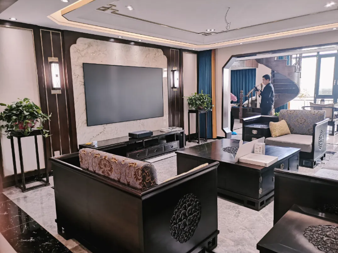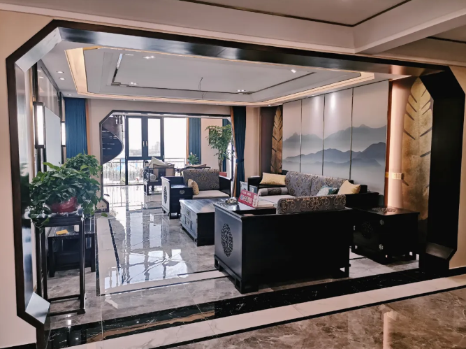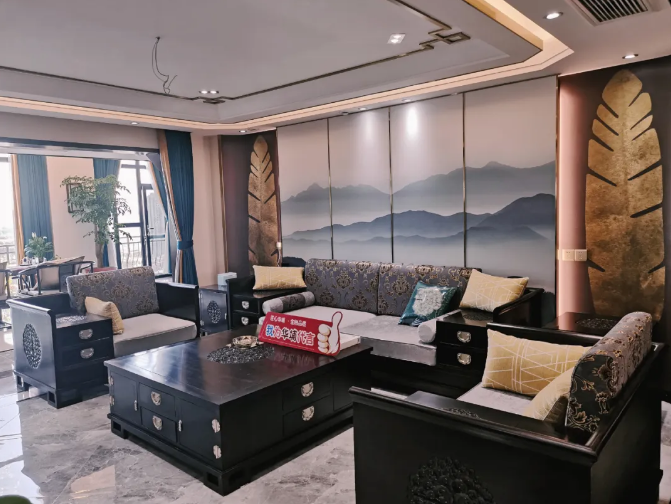 目光再轉(zhuǎn)向我們的客廳,透過八角斜角造型的門框,觸及的是1+3+1的客廳沙發(fā)布局,所有家具全部出自紅木,一榫一卯,無論是品相亦或質(zhì)感,都將中式的精工呈現(xiàn)。