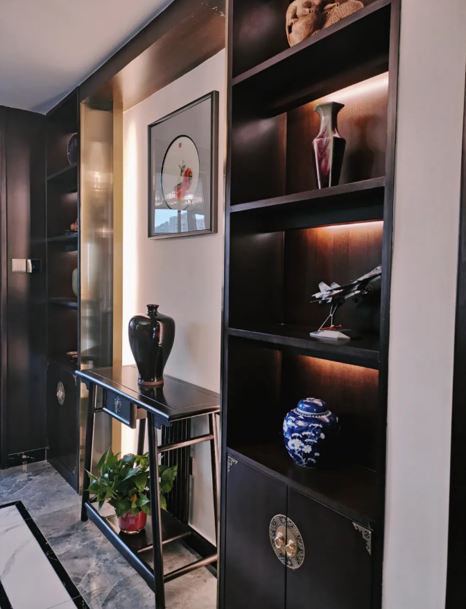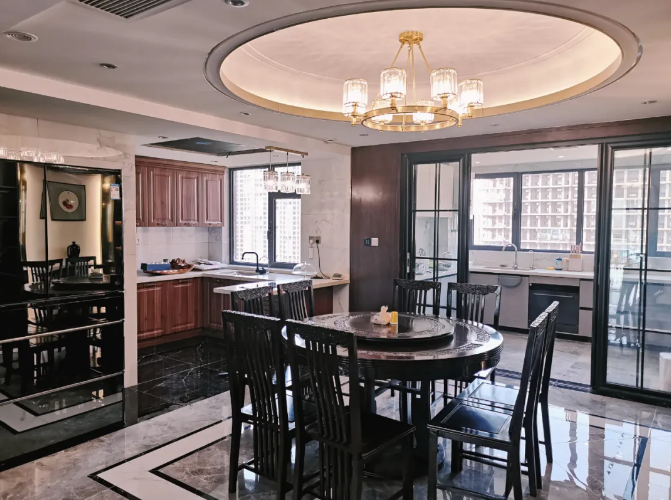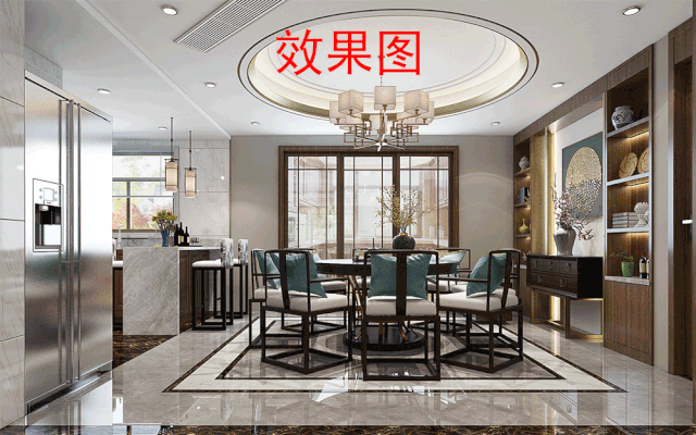 回字形地面,還做了窄邊灰和方拼,中式元素在這里得到了淋漓盡致的發(fā)揮。再轉(zhuǎn)身看餐廳背景,嵌入式酒柜,以不銹鋼弧形內(nèi)嵌燈帶做端景對稱,裝飾與照明效果極佳。
