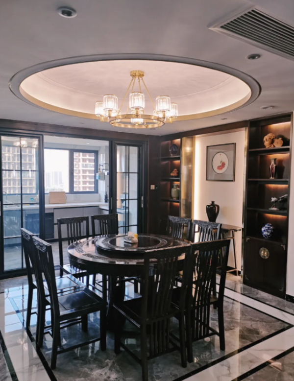 餐廳以“天圓地方”做布局,頂面做30公分的圓形吊頂,以香檳色不銹鋼條+金屬條點綴,正好與8人圓餐桌相融合。