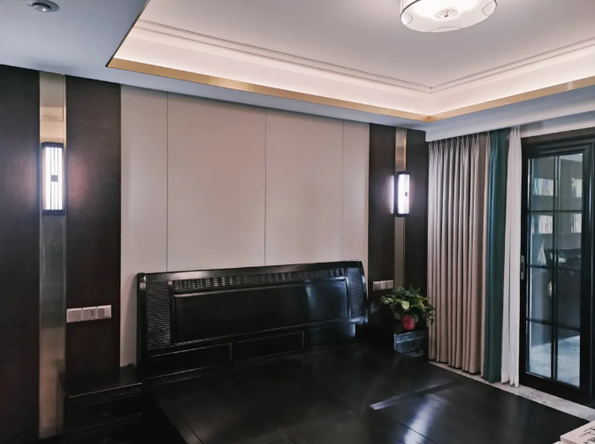電視墻是石材+護墻板+不銹鋼金屬條做的凹凸造型,美中不足的是,受疫情影響,雕花隔斷一直沒有到位。沙發(fā)墻是兩側(cè)采用壁畫弧形凸出,嵌入燈帶燈槽,中間是山水水墨畫,用柔美來弱化線條的剛直。