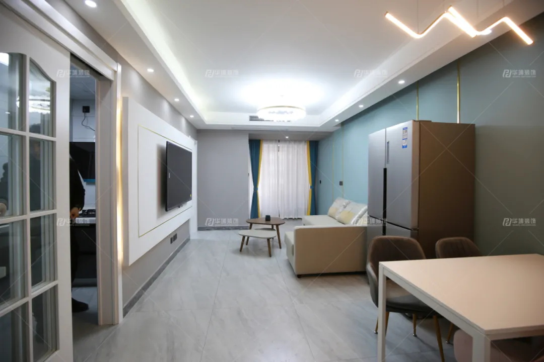 客餐廳開放設計,藍綠色的背景墻從餐廳一直延伸到客廳陽臺,放大了整個空間的視覺效果。電視墻則夾在廚房與衛生間中間,通過白色的石膏板進行凸出,再以金屬線條勾勒,做一圈燈帶,來強化舒適的感官效果。