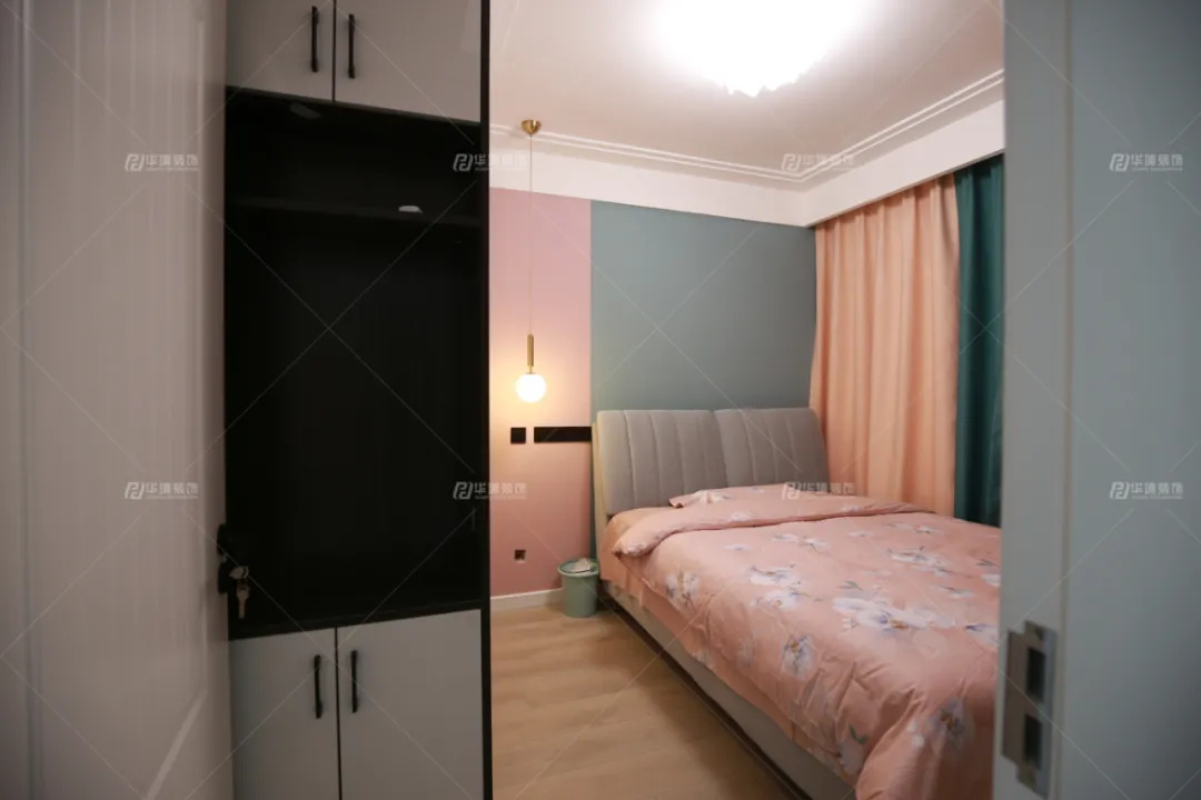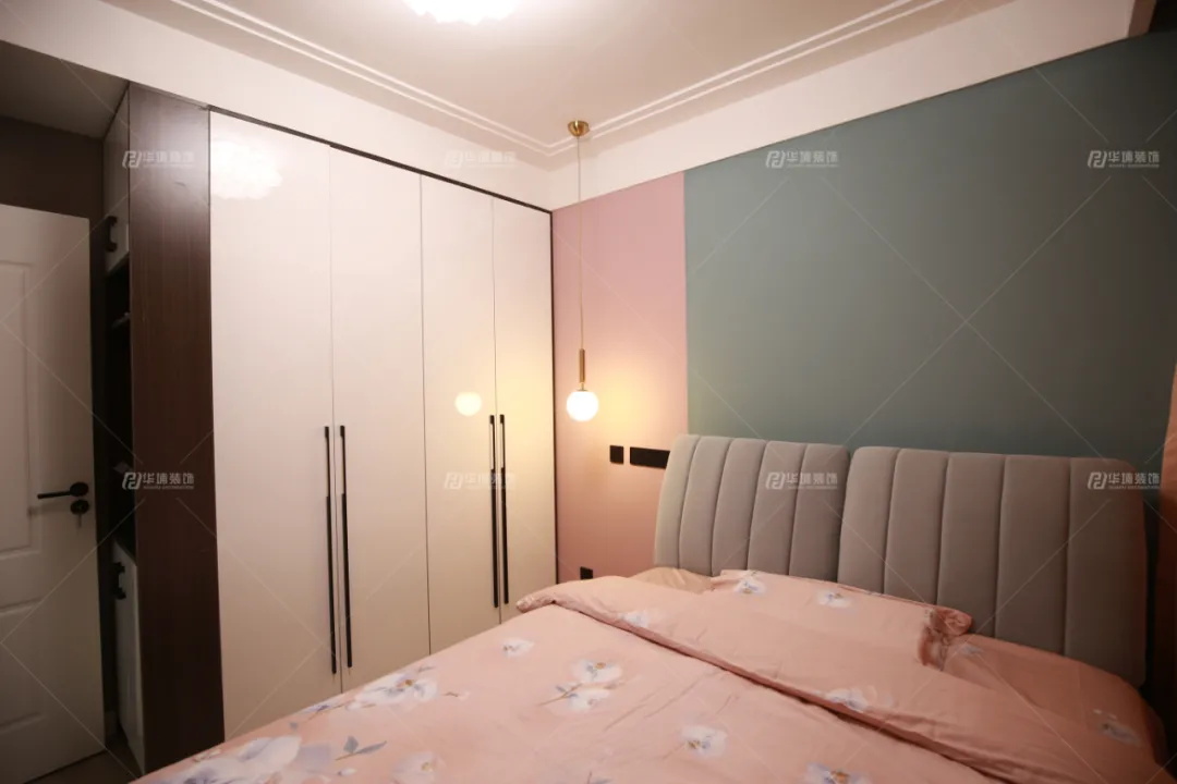 主臥以柔粉與藍綠做撞色設計,再以壁燈垂吊輔助光源,讓溫馨浪漫的少女感瞬間襲面。