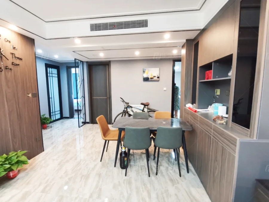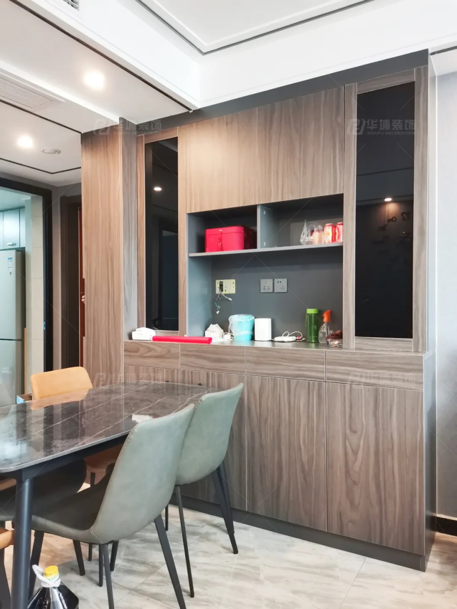 原戶型玄關只有40公分的寬度,略微擁擠,設計師借用了餐廳酒柜的空間來加深鞋柜,完成入戶不同功能需求的分區。