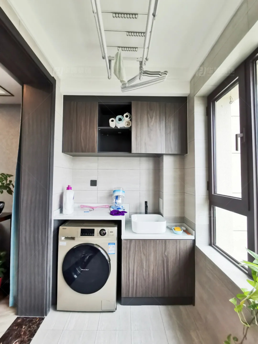 陽臺足夠寬,做洗衣房還是很充足的。依然是吊柜+洗手臺+洗衣機+地柜的組合,錯層+臺上盆的細節設計,讓做家務的心情都是甜美的。