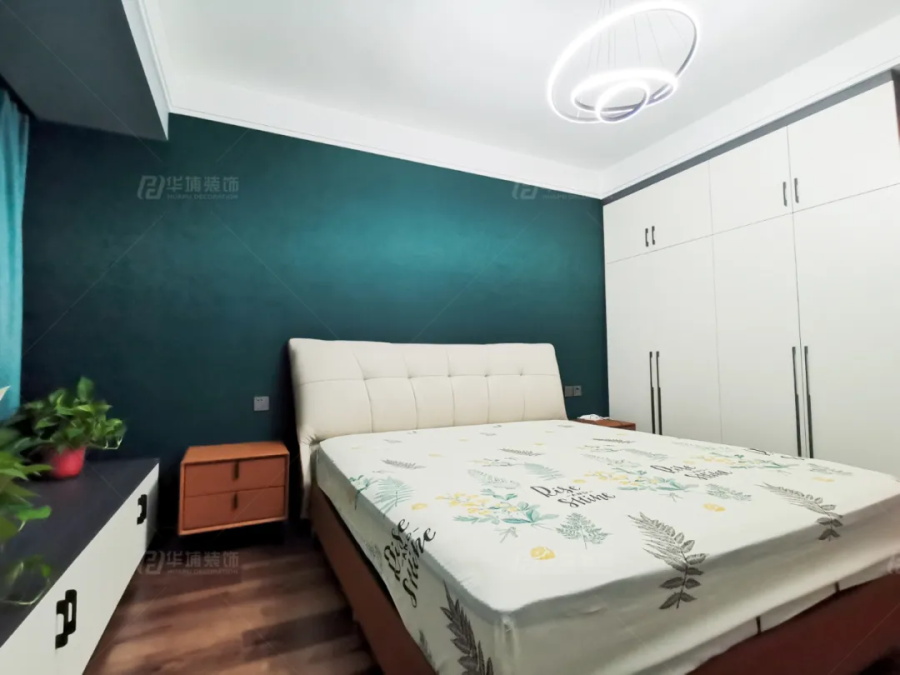 墨綠+白色,張弛有度的空間配色,瞬間定義主臥高雅的基調。臥室原飄窗砸掉重建飄窗柜,用來收納貼身衣物或者是做一些雜物的儲存,更加實用。