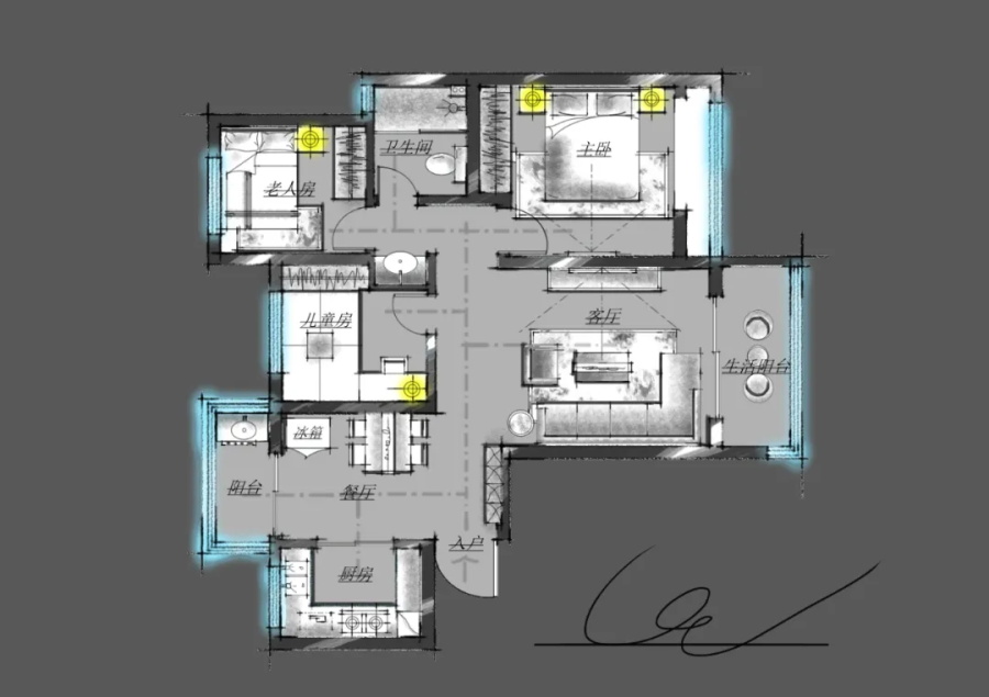 由于原始戶型存在通風差、采光不足的問題,設計師做了局部改造:(1)原戶型中兒童房門與衛生間門正對,影響兒童房的采光與通風,設計師將原兒童房門封掉,開在了客廳朝向,將客廳的采光與通風引入;(2)衛生間做了干濕分離,方便一家人后期的使用。