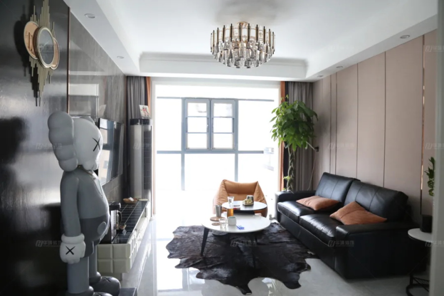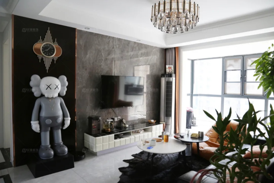 客廳,設計師將簡練的造型與光潔的質感融合在一起,石材背景,木質護墻板,金屬線條,皮質沙發,青灰的色彩搭配,讓整個空間干凈利落。讓我們把目光凝聚在這個網紅潮款雕塑擺件,暴力熊的脖子上有個十字架,祈福、庇佑,周身安好,一生平安。