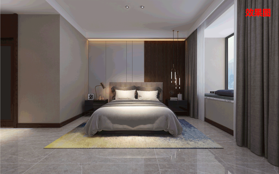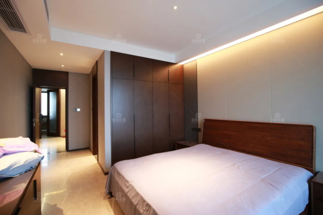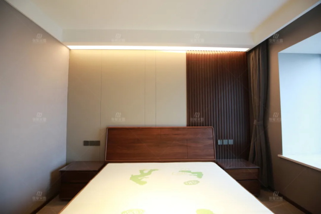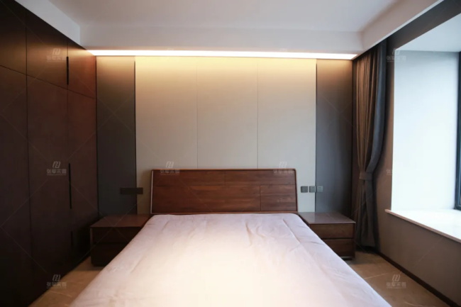 這里展示的是一樓和二樓的主臥,整體都是以木格柵融合硬包做墻面背景,再以反光燈槽做輔助光源,沒有刻意的雕琢,僅以本真取悅生活。
